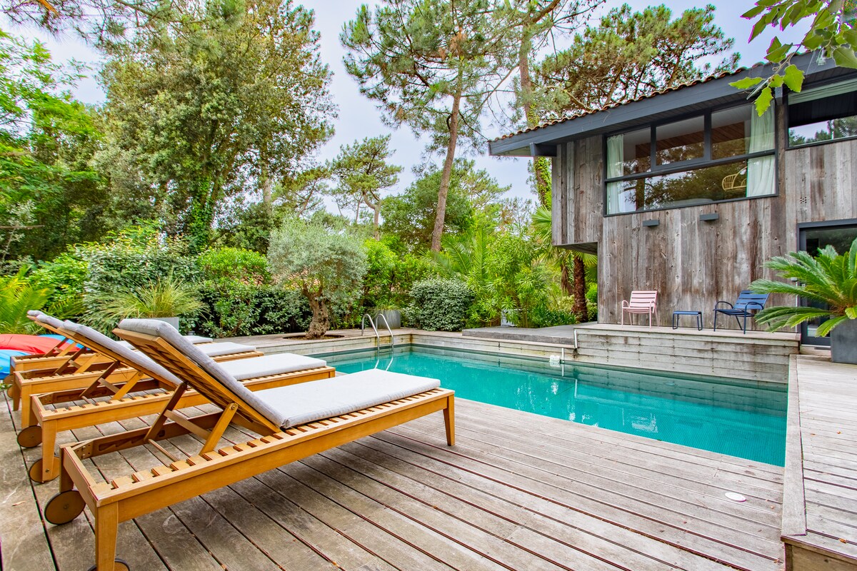 This beautiful newly renovated villa with heated pool is ideally located on the front line in the Jane de Boy neighborhood, a true natural jewel at the beginning of the peninsula. You will be facing the Bassin d'Arcachon and the state forest without any neighbors. You can walk to the basin that you will see from the house. The famous Pastourelles Beach is just around the corner. The market and all local shops are 700 m from the house.