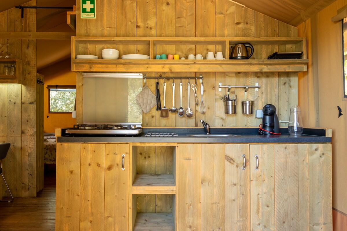 A cosily furnished glamping tent with stylish vintage charm awaits you. All the conveniences of the modern world, yet far away from it all. Set in the heart of nature, overlooking the ancient cork oaks, on an entire campsite with sanitary facilities, a kitchen and plenty of space. All this on a subtropical estate with numerous beautiful spots that invite you to linger and relax. And yet, you can still get to bathing, eating, drinking and hiking quickly.