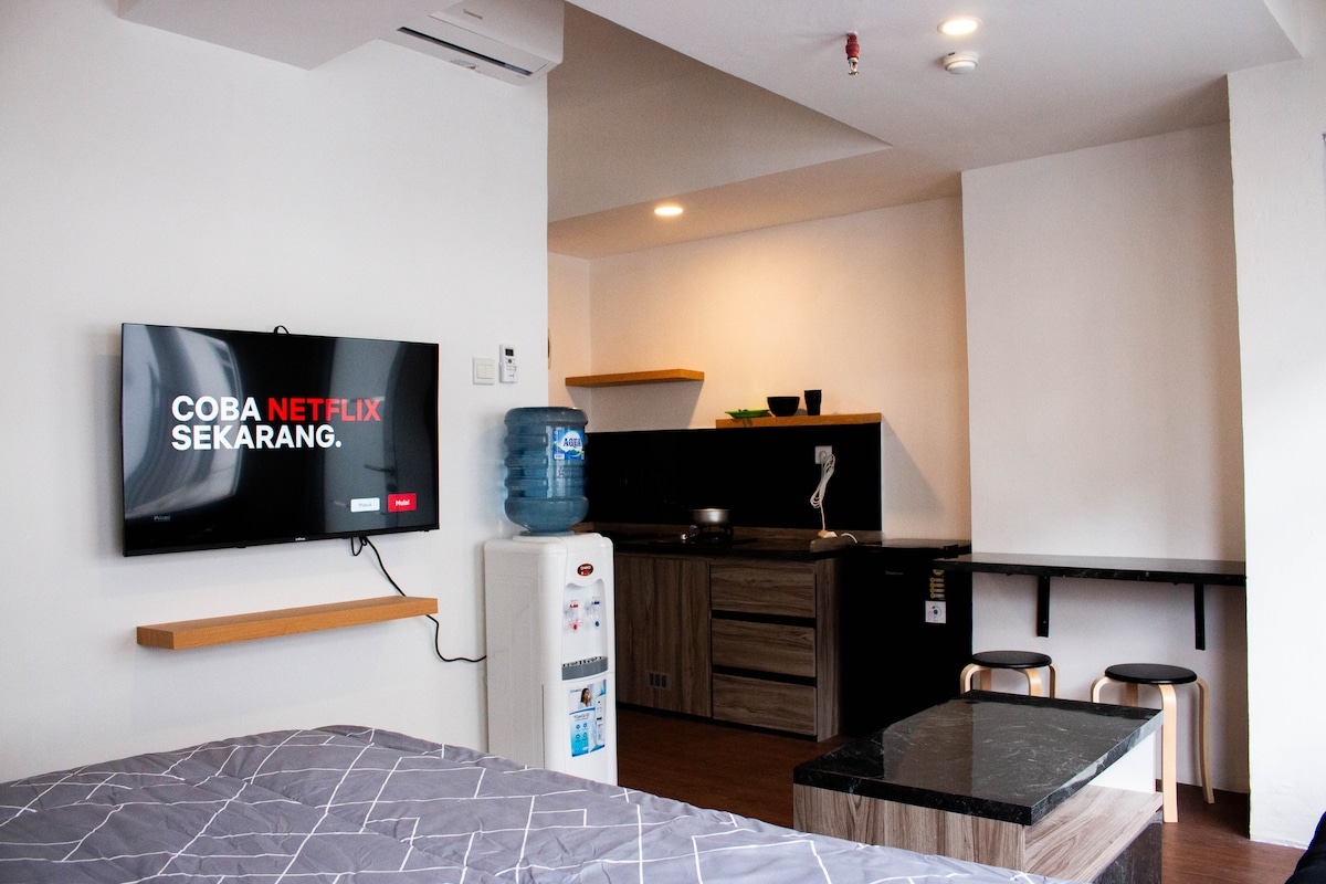 Immerse yourself in the vibrant heart of Bandung at this stylish studio on 10th floor of Parahyangan Residences. Enjoy modern amenities like a fully-equipped kitchen, high-speed Wi-Fi, and a 50" smart TV with Netflix. Indulge in resort facilities, contactless check-in, and nearby conveniences for a perfect staycation, holiday, or work-from-home experience. Now featuring a Reverse Osmosis drinking water, food waste disposal, washing machine, speaker & music streamer.