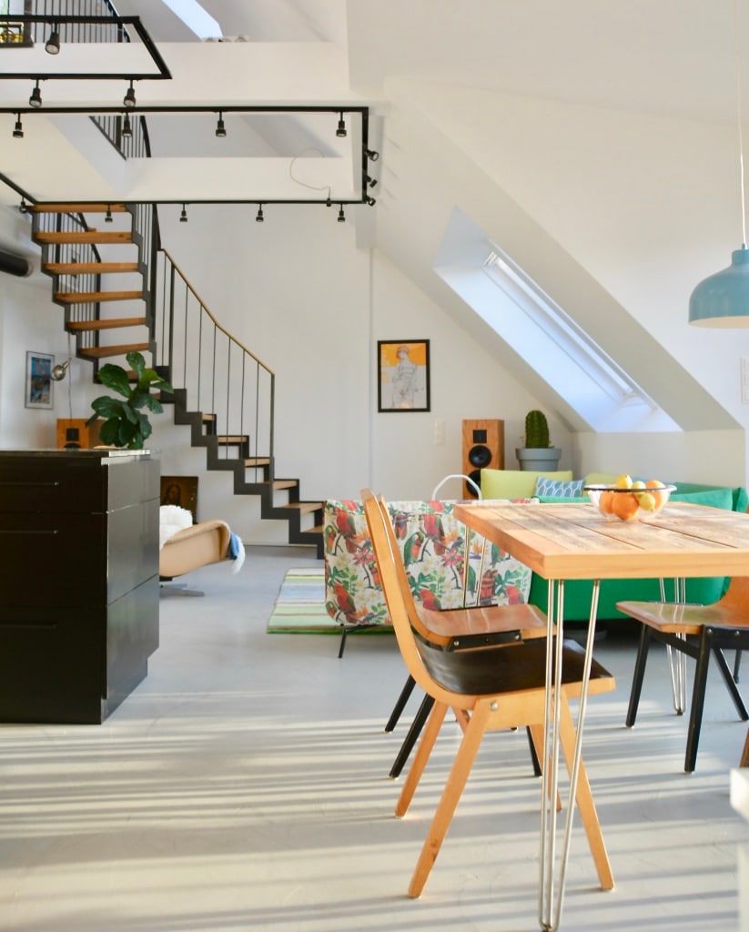 A cozy, redesigned historic apartment overlooking the roofs of historic Vienna. Materials such as brick, wood and steel have been carefully restored, exposed and complemented with a modern designed wooden furniture in the center of the apartment.