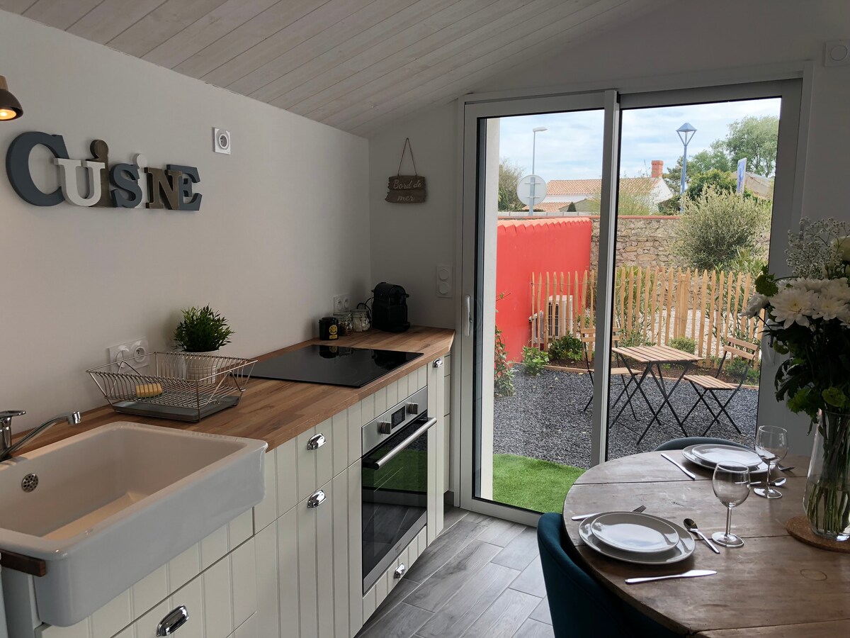 En plein cœur du charmant village de L’Epine sur l’ile de Noirmoutier, à 30 mètres des commerces (boulangerie, charcuterie, épicerie, presse, restaurants…) Équipé de la fibre depuis mars 2026 Logement composé d’une pièce de vie avec canapé BZ, cuisine aménagée et équipée (machine Nespresso) et toute la vaisselle nécessaire. 1 chambre avec lit de 160, placards. L’ensemble donne sur un jardin paysagé (exposition ouest) avec terrasse, salon de jardin et chiliennes.