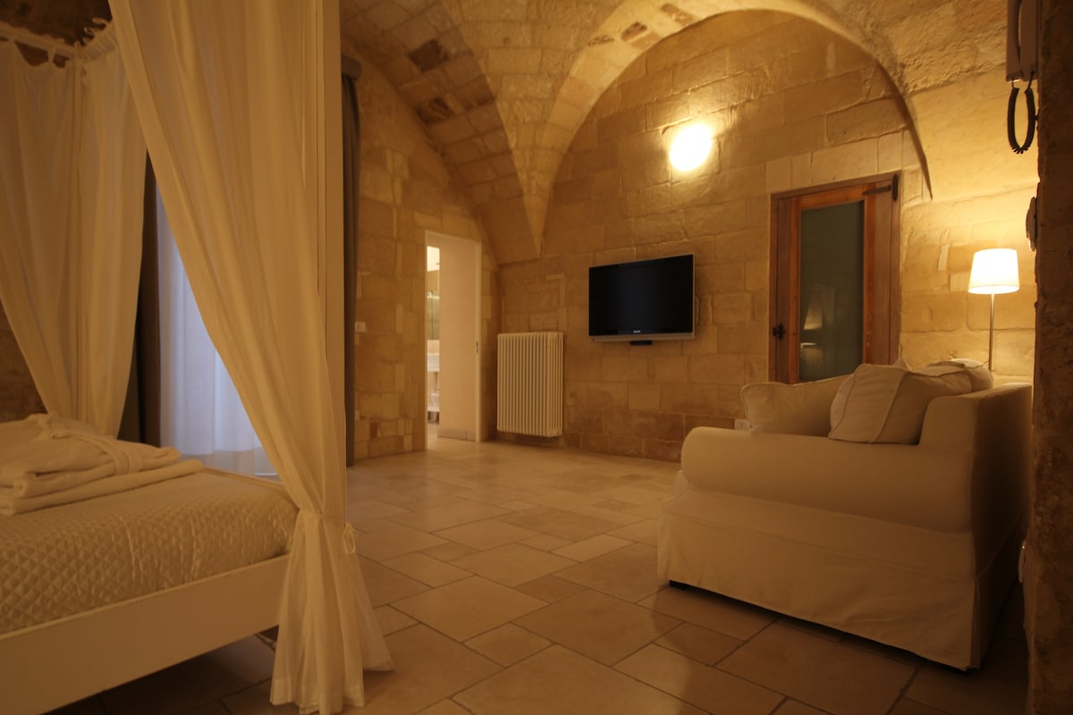 Martina's suite is a cozy and charming historic home located in the historic center of Lecce. A few steps from the highest expression of Lecce's Baroque, the Basilica of S. Croce, and the beautiful Piazza Sant'Oronzo, Martina's Suite consists of a comfortable and exclusive double bedroom, with walk-in closet, flat-screen TV, a large bathroom and a strategic sofa bed for two additional seats, it also has an equipped kitchenette and refrigerator.