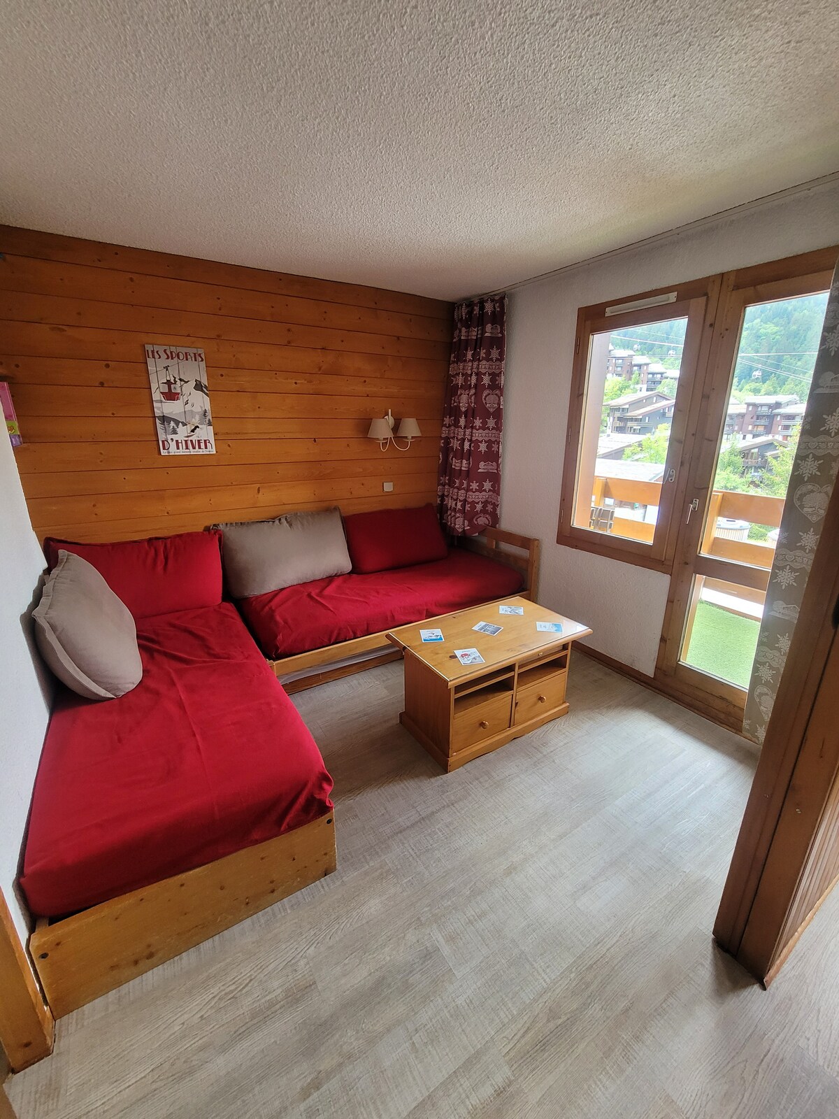 Valmorel, crunchy neighborhood, apartment in Lauzière residence below, 2 rooms divisible 28 m2 at the foot of the pierrafort gondola. southwest, bathtub-shower, wc, 1 sleeping area with 2 single beds or queen bed, 1 second sleeping area with 2 separate beds with sliding partition, small kitchen with dishwasher, large artificial grass balcony on a raised ground floor; new parquet floor for winter 2025 ideal location for ski departure. Sledding area in front of the residence. Sheets not provided, for rent