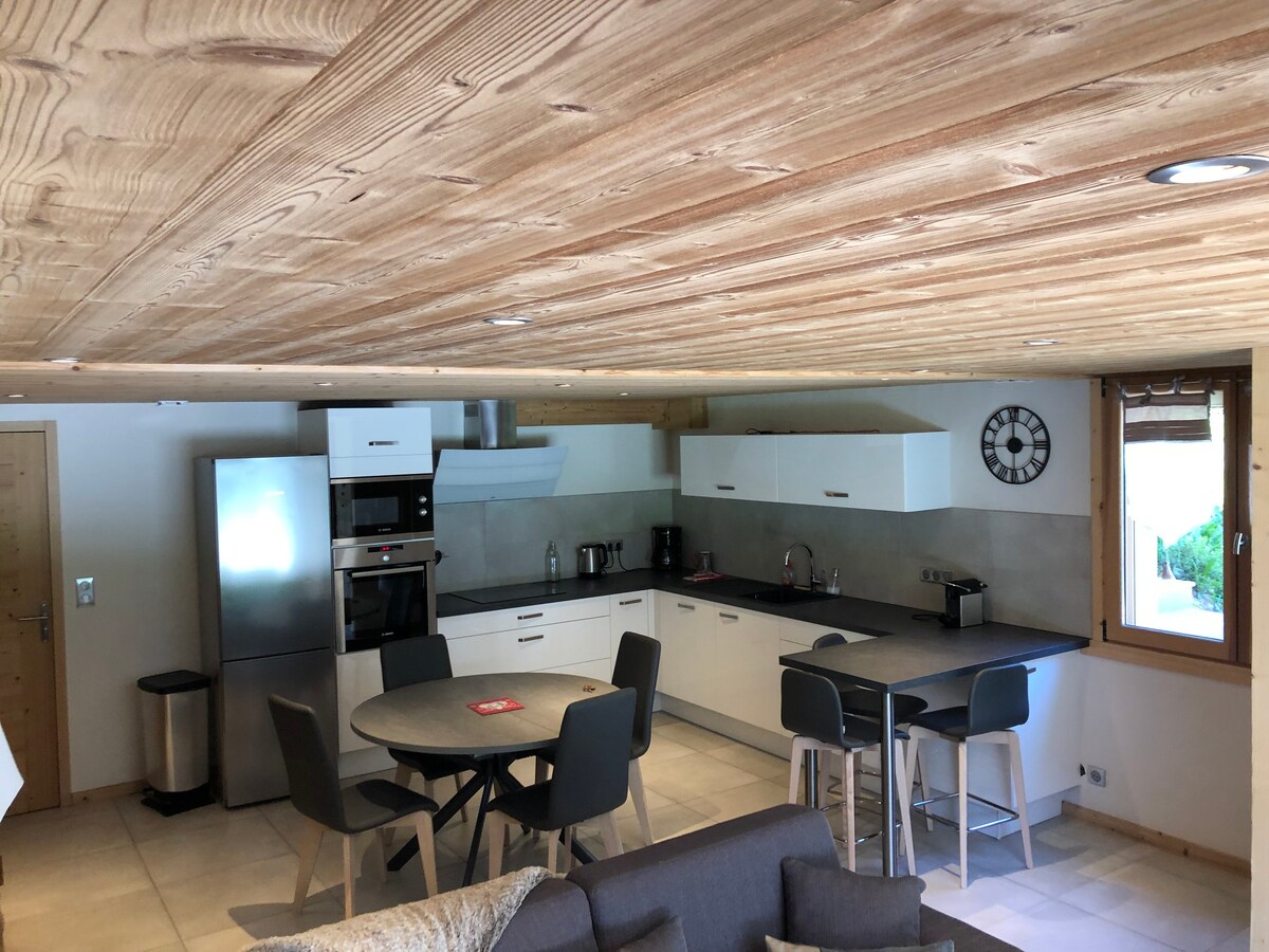 60m2 apartment in ground floor in wooden Savoyard chalet. Capacity for 4 people (max 6 with sofa bed); Fully equipped, close to the alpine ski slopes by shuttle link: shuttle stop 100m away and then 4 kilometers from the foot of the slopes. 100ml from the cross-country ski slopes; golf 300 meters away. Quiet places, surrounded by mountains, meadow, forest and river. Linens and towels provided. Ski room and storage: +15m2. Terrace and garden ideal for children.