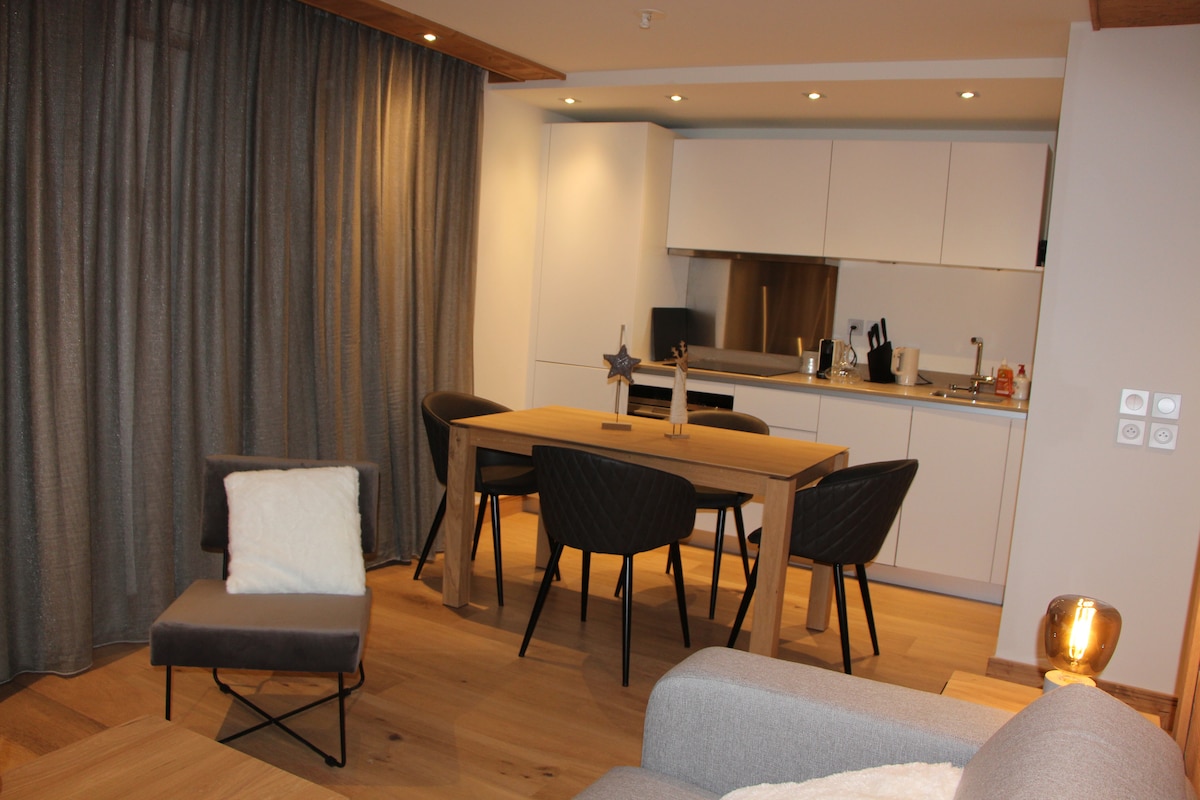 This perfectly located home in the center of the village offers easy access to all amenities. It consists of a master suite (with shower room and toilet), a mountain corner with bunk beds, a bathroom, a separate toilet, a living room and an open kitchen. The apartment is fully equipped (washer-dryer, TV, Wi-Fi, Nespresso, dishwasher) and has a large terrace, a parking space, access to the fitness area/sauna/hammam, a private ski room.