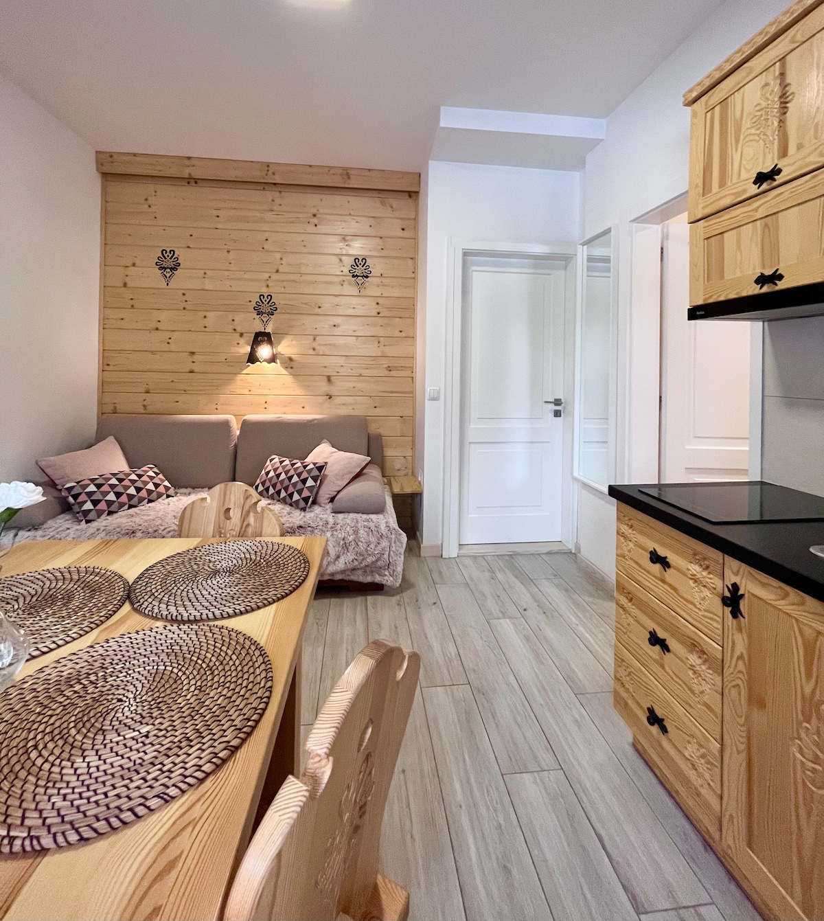 Our apartment is located at the first floor of Tamok Lifestyle Villa, it's perfect for a couple looking for a romantic stay, in a place offering great mountain views. Beautiful Tatra mountains are right behind the windows, so you may enjoy the view from your bed or balcony. It offers 20 sq meters of space, consist of a living room with kitchenette and a bathroom. The balcony is perfect for a morning coffee on a sunny day:)