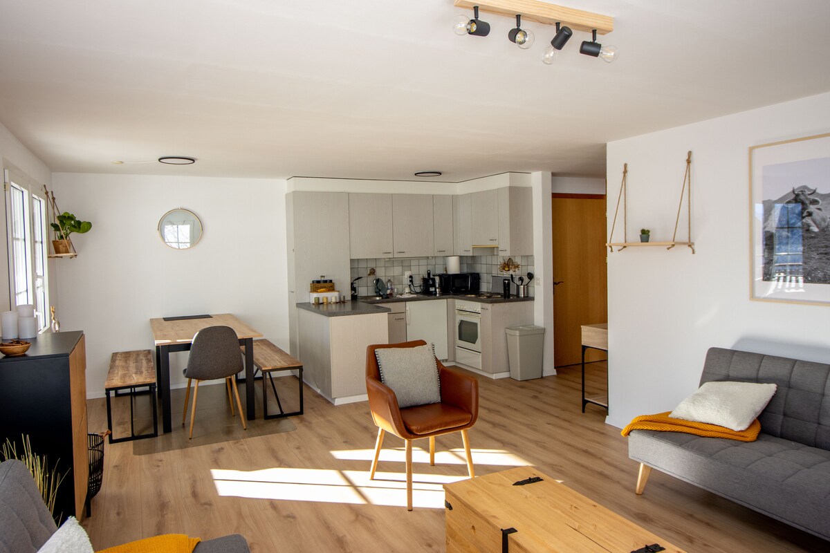 The apartment is in an old house with only 3 other apartments and 1 private Finnish bath It is renovated at ground level and paintings and retains a typical Swiss character. Ideal location: 150 m from the swimming pool, 100 m from the TV, 200 m from Migros and 50 m from the bus stop. Possibility of sledding in front of the house. Free parking space available. Check-in is easy and can be autonomous, but we will be happy to host you to give you some explanations and advice