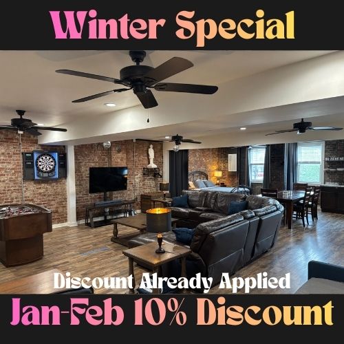 Couples will be comfortable in this spacious and unique space. Open floor plan offers a King size bed to relax in while additional guests or kids can sleep on the pull-out queen sofa bed. Water, snacks, and granola bars are provided in the efficient kitchen area. Centrally located, it’s walking distance to the area shops, museums, and restaurants. Area wineries are approximately a 20-25 minute drive. This is a downtown above apartment with views of town.