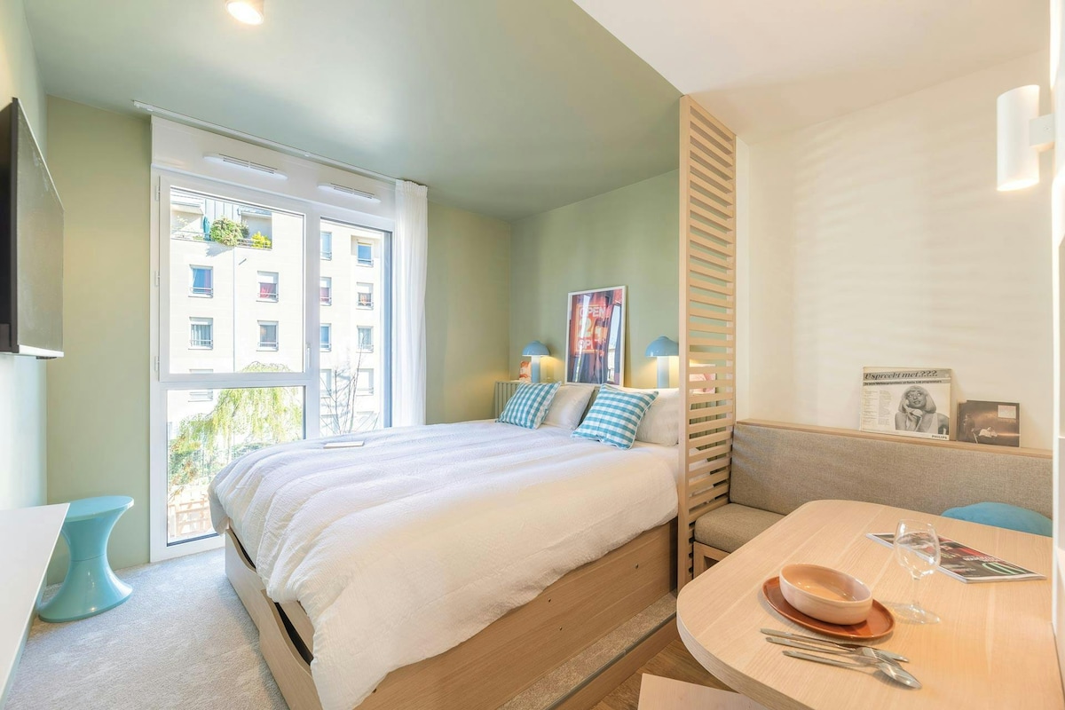 You open the door to your 18sqm double studio in Montpellier, and it feels like a breath of fresh air. The space is bright, functional, and welcoming. The Queen-size bed invites you to fully unwind. Everything is designed for your comfort: a fully equipped kitchenette, a dedicated workspace, a private bathroom, and high-speed Wi-Fi. Storage space: wardrobe, hanging rail, and under-bed compartments Equipped kitchenette (dishes, microwave, fridge, cooking plates), Dining & work area.