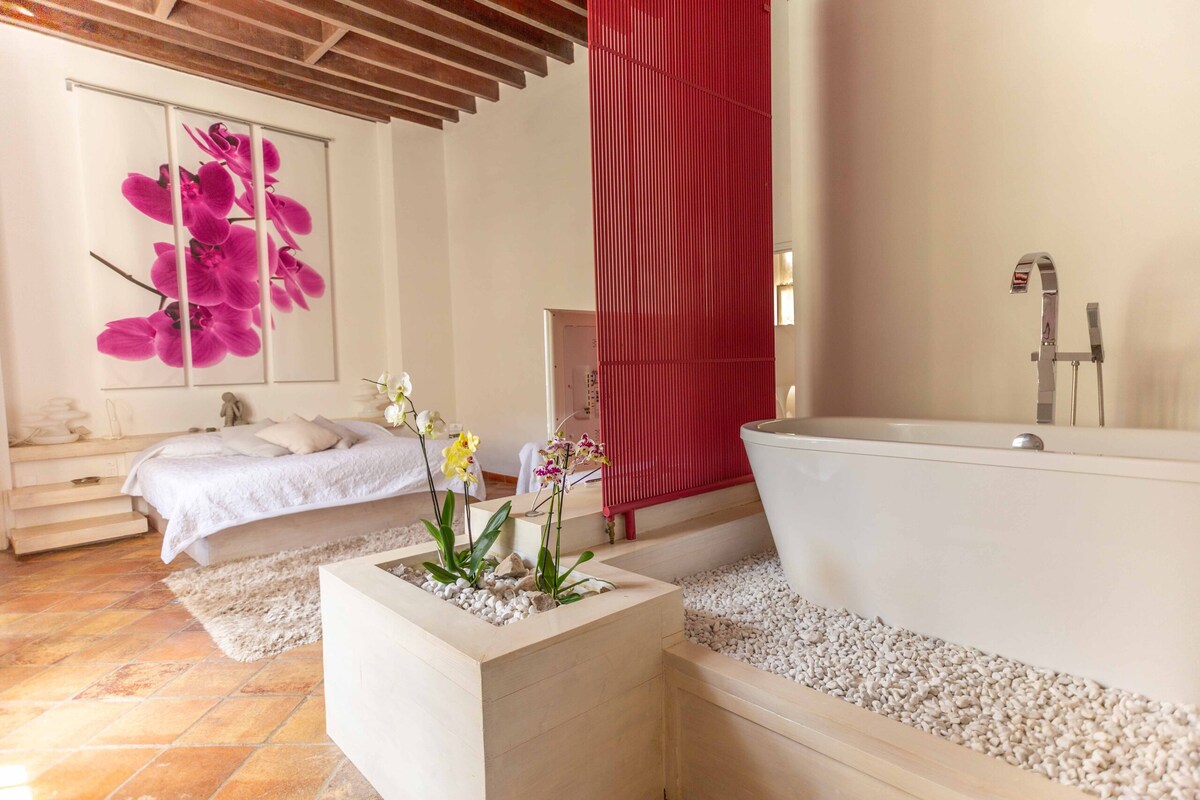 La Maison Soleil is a renovated former mansion, located in the city center. With refined Mediterranean design, this hotel combines historic charm and modern comforts. This bright attic room, decorated with touches of local craftsmanship, offers a warm and soothing atmosphere. Ideal for a relaxing getaway, Maison Soleil promises an authentic experience.