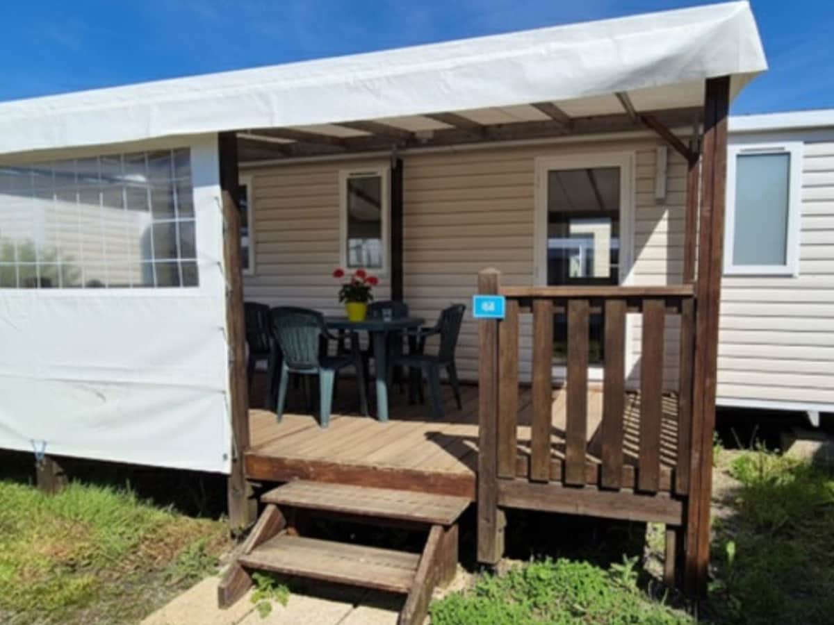 - NEW mobile home, 3 bedrooms, 5 people, super comfort, air-conditioned/heated - Covered terrace. Washing machine. - Sunbathing + tree with shade (ideal for resting!) - 4 bikes, barbecue - Large plot to park car and trailer - Quiet driveway, without neighbors - 4-star campsite 50 m from the beach, indoor/outdoor pools - Camping fee: €5/day/adult and €2.50/day/child - Complete cleaning - Pillows + duvets + disposable mattress covers provided - Bed sheets not provided