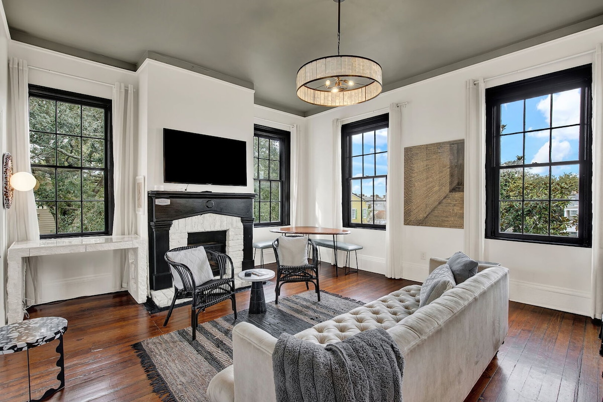 Book this place if you really want it ALL! Clean lines & modern updates, along with DROOL-WORTHY, 100+ year-old, heart pine floors & exposed brick fireplaces. Our 1887 Victorian has been lovingly restored & infused with vibrant local art, haint blue-green ceilings, and a fun sense of style that helps even the weariest travelers get excited about exploring our AMAZING city. This INCREDIBLE upstairs haven is a stone's throw from FAB Forsyth Park in the heart of the Victorian district. SVR-01068