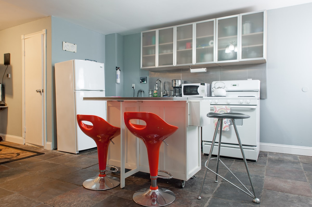 You're invited to stay in a charming historic brownstone row house. Located in a historical neighborhood of Jersey City. Newly renovated one bedroom apt. Enjoy access to the urban oasis in the backyard. The apt is outfitted with a sleek modern aesthetic to make your stay comfortable and pleasing. Amenities include Ice machine, hanging clothing rack, dresser, work area, hair dryer, Iron & ironing board and more. In walking distance of restaurants & coffee shops. 30 minutes to NYC.