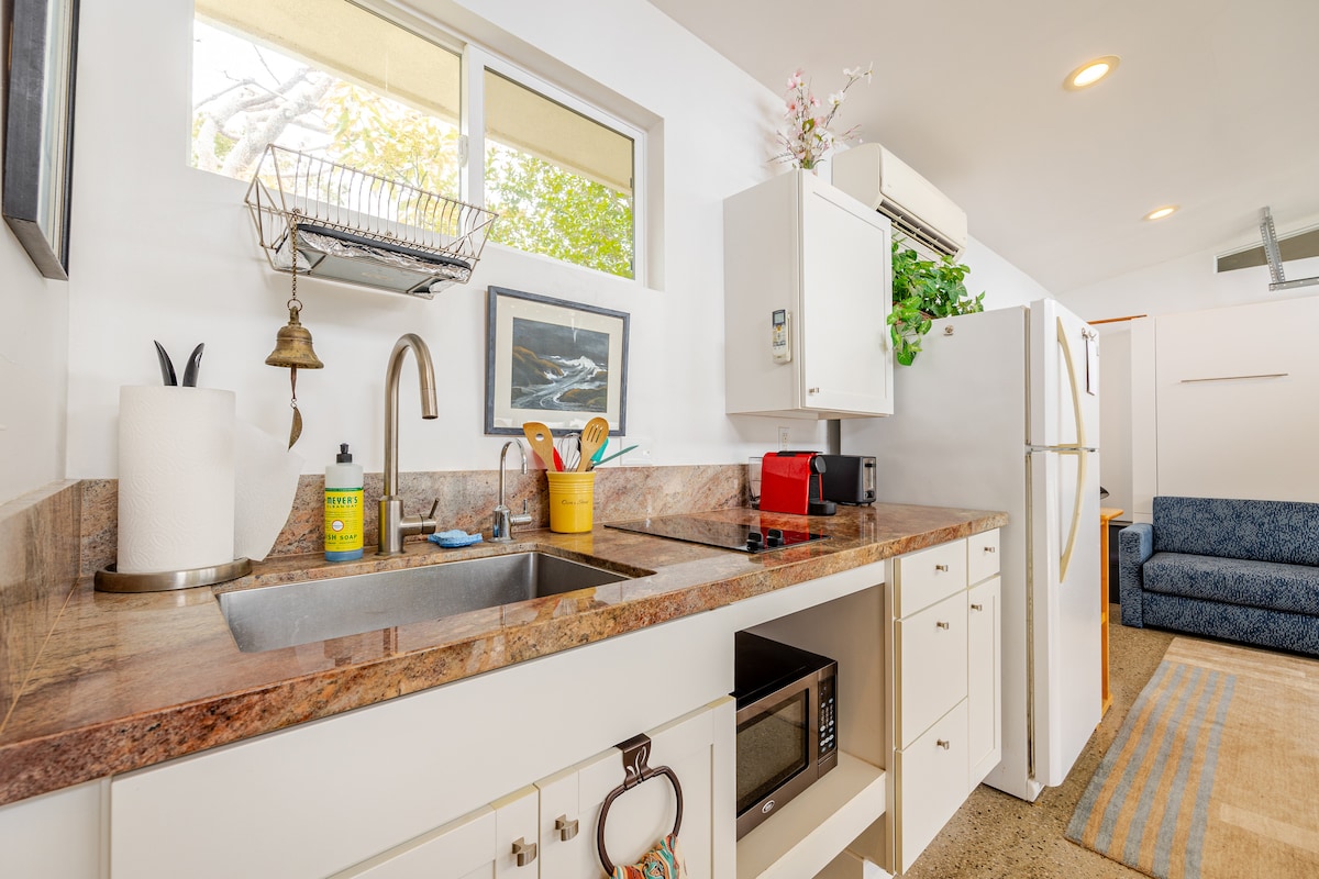 For a quiet nighttime stay and light-filled Studio in Costa Mesa with a lovely, large European backyard behind our family home. The bright, sunny & airy one-room Studio with roll-up window wall has half curtains and is furnished with a queen-size Murphy bed, dining table, chairs, kitchenette, and TV. Enjoy the temperate weather of Coastal Orange County and relax in a patio area with its chairs and table. Murphy bed setup - look for the link