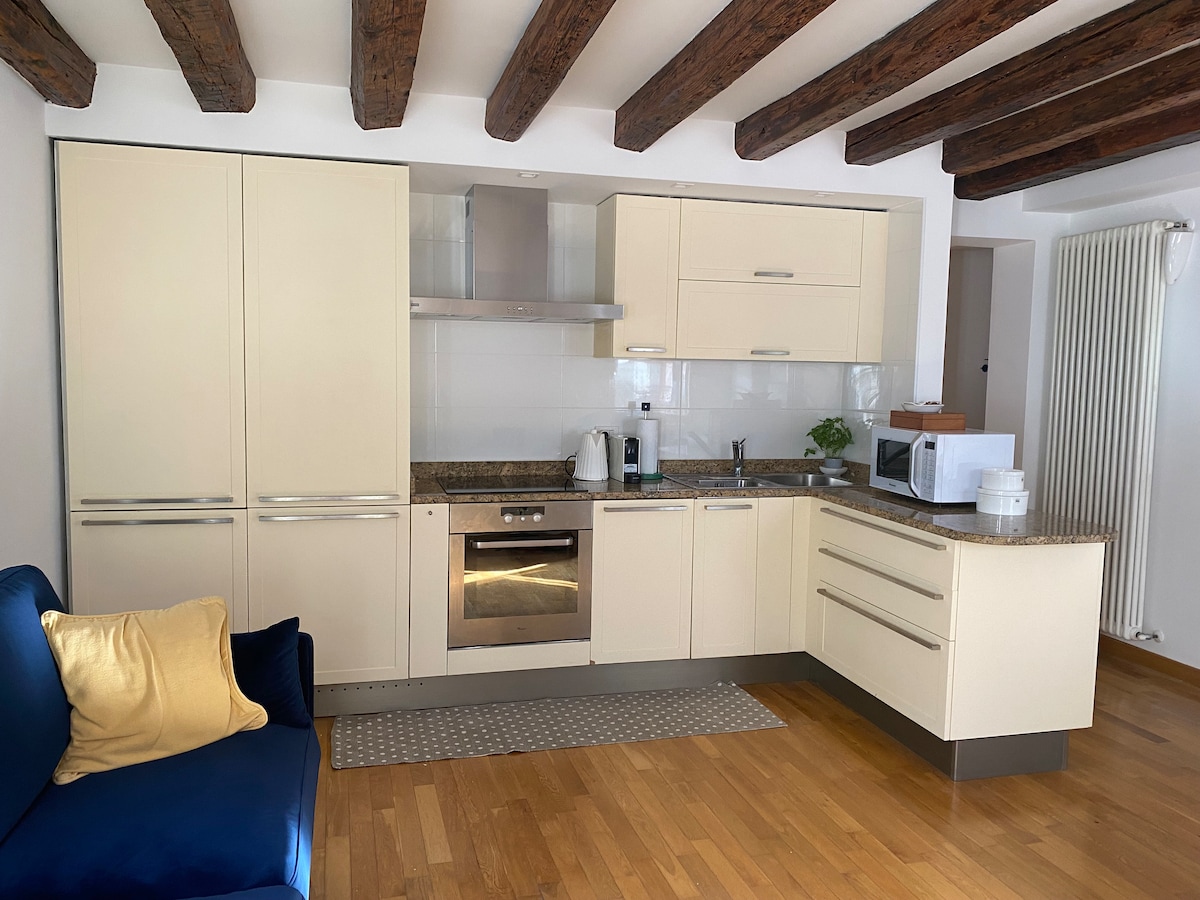 In the heart of Venice, 3 minutes from San Marco and 6 minutes from Rialto, Cà Laura has been designed to make you enjoy a true Venetian experience to the fullest, enjoying a splendid view of one of the most characteristic canals of the city'. It consists of a full kitchen, with dishwasher, washing machine, oven, microwave, Nespresso machine and Alessi dishes and glasses and pots. Double bedroom, sofa, 44-inch TV, fiber Wi-Fi, air conditioning in both the bedroom and the living room.
