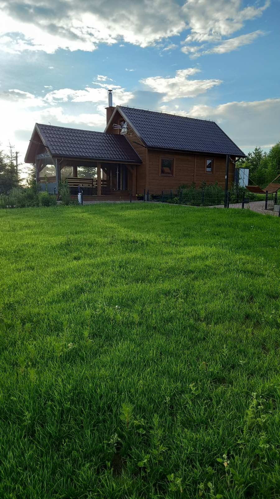 Witam wszystkich Gości . Piękny widok na nasze warmińskie pola i staw pełen ryb jest nie zapomniany i zachwycający. Nasz nowy domek drewniany jest nie wielki ale bardzo przytulny . Składa się z salonu z kuchnią oraz łazienką 35m2, poddasze dwie sypialnie pod skosami (nisko).Przy domku taras z ławami i stołem. Wolnostojąca biesiadna wiata z ławami oraz stołem. Grill i miejsce na ognisko . Plac zabaw dla dzieci . Sauna oraz jacuzzi na powietrzu .Hamak .Parking .