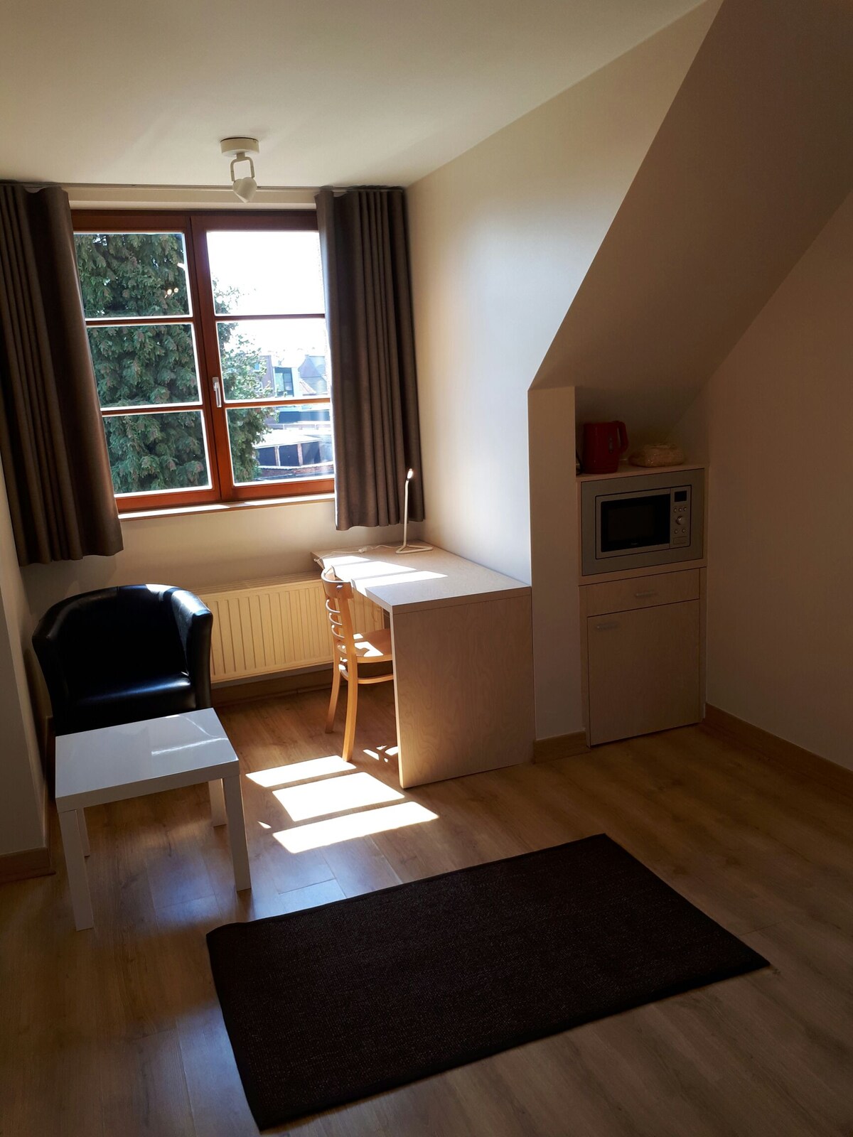 Spacious studio flat on the small ring road, a stone's throw from the bustling city center and yet quietly located. You have your own bathroom and fully equipped kitchenette in the room. The studio is located on the first floor on the street side.