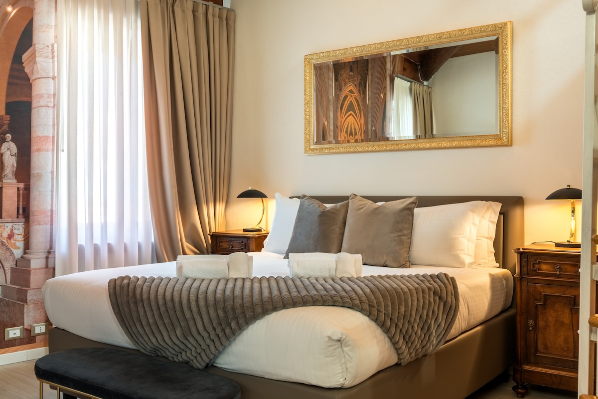 If you want to find in the same space, the best which Italian craftsmanship offers, you'll find it here in DOMUS AUREA. In the heart of Verona’s old town, you will find stunning Renaissance ceilings, Florentine furniture, luxurious Murano glass chandeliers, gorgeous view from the balcony and much more. You are in a stone's throw from Giulietta's house, Piazza Erbe, luxurious via Mazzini Last but not the least, there's a bottle of excellent Italian wine to meet you. МЫ ГОВОРИМ ПО РУССКИ!!