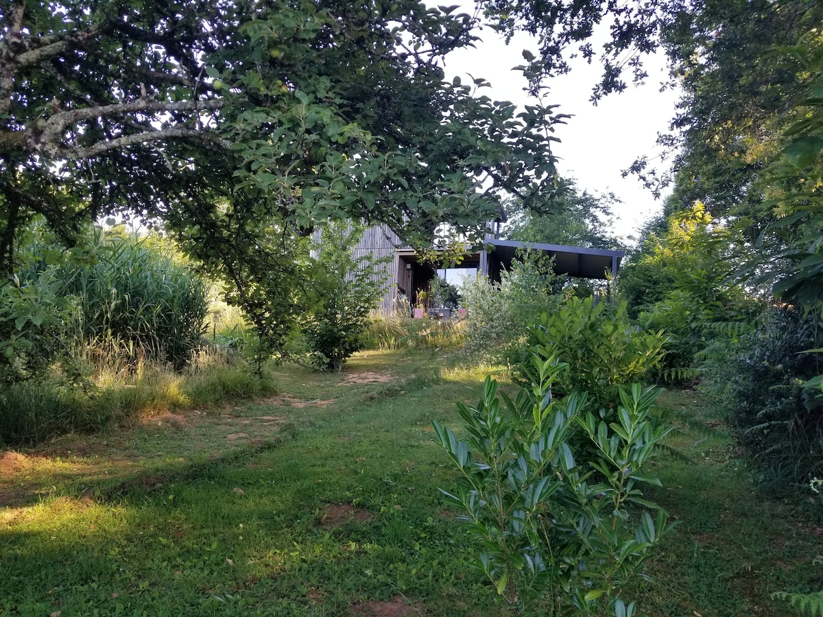 For 1–4 people. In Corrèze, a comfortable wood-frame eco-lodge. 5 km from the A89 (exit 22) on the banks of the river. Enter an enchanting environment, a moment suspended in the heart of nature... For holidays, visits, work. A short break in a natural and romantic setting entirely dedicated to nature (included: sheets, bath towels, dish towels, soap, household products, breakfast on reservation). Forest, river, walk, living maze, forest garden...