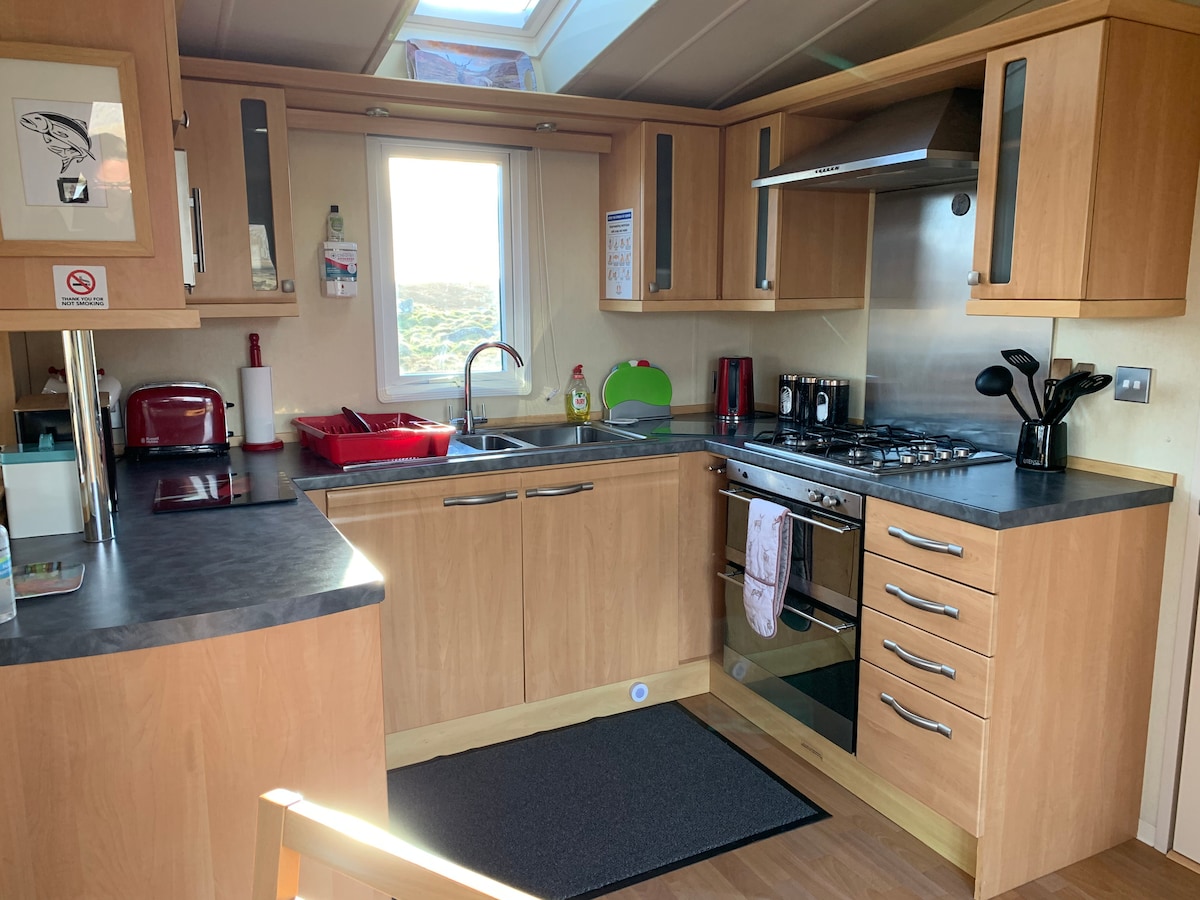 2 bedroom caravan with gas central heating. Master bedroom has a Double size bed an en suite and plenty storage. Second bedroom consists of 2 single beds and storage. Main bathroom has a fully closed walk in shower. The Kitchen/living area is open plan with a large fridge freezer, gas cooker, microwave, kettle & toaster. The living area has a 32" smart tv with freeview, electric fire and 2 recliner sofas. The living room opens out on to a patio area via double patio doors.