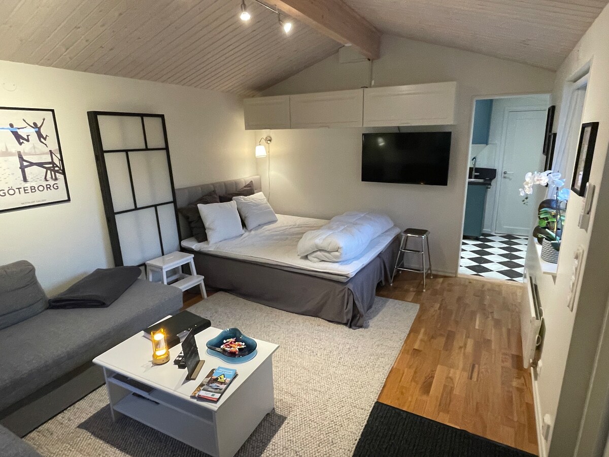 Unik 60m2 källarlägenhet som är en del av en större villa. Familjevänligt med massor att göra för barnen, lekborg, bollhav, och mycket leksaker. Privat toalett med dusch, kök, sovrum och allrum. Modern skandinavisk rustik inredning med betonggolv och designmöbler. 10 min promenaded till en lite hamn med fina bad. Busshållplats i närheten , bara 20 minuter to Göteborg Centrum (Linneplatsen)!