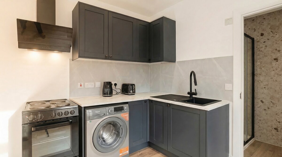 A lovely self-contained studio with patio area and free parking. It contains a king bed, chair & work desk; kitchen with fridge, sink, hob and microwave and all necessary crockery and utensils etc; wardrobe, drawers; bathroom with good size shower; wifi TV and USB sockets; its own central heating and hot water systems and modern decor. Towels, tea-towels, soap, washing up liquid and bed linen provided along with some basic food items such as salt/pepper, teabags, coffee, sugar, squash, etc