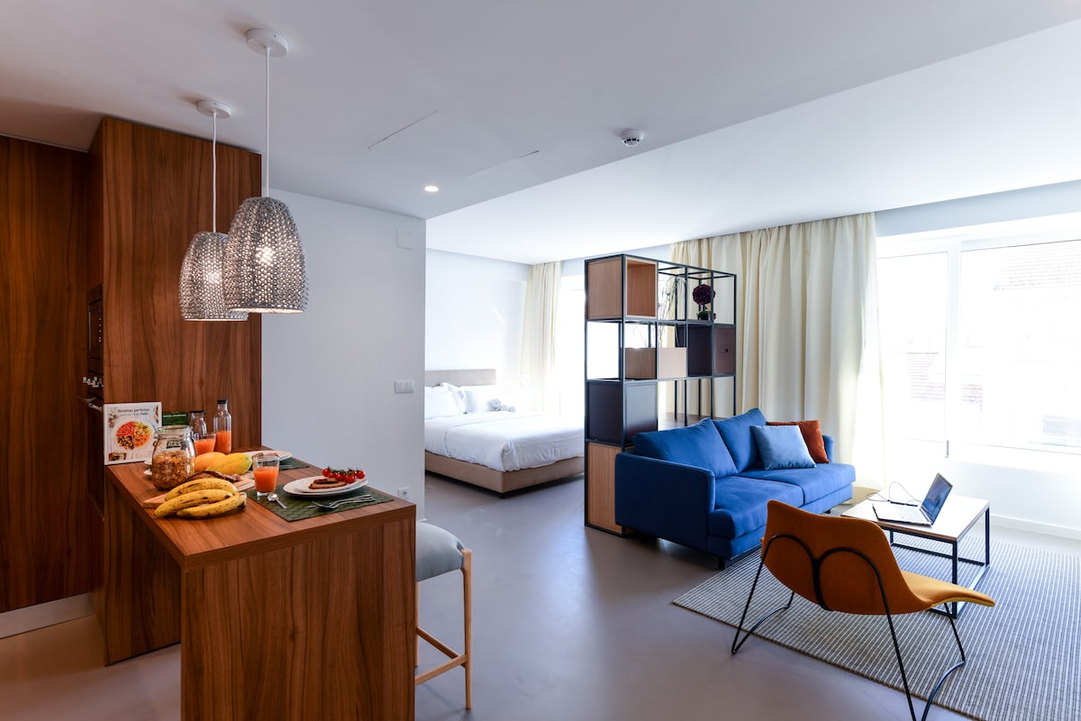 Com cerca de 45m2 tem tudo o que precisa para uma otima estadia. O apartamento está equipado com uma cama de casal queen size, casa de banho com box c/ chuveiro, secretária para trabalhar, uma smart tv, internet e uma cozinha totalmente equipada para cozinhar. Um espaço co-work, ginásio e lavandaria encontra-se no piso -1. Temos garagem disponivel por €15/ dia. Todos os apartamentos são de tamanho e aspeto muito parecido, o que muda é o layout. Temos limpeza cada 2 dias de Segunda - Sexta.