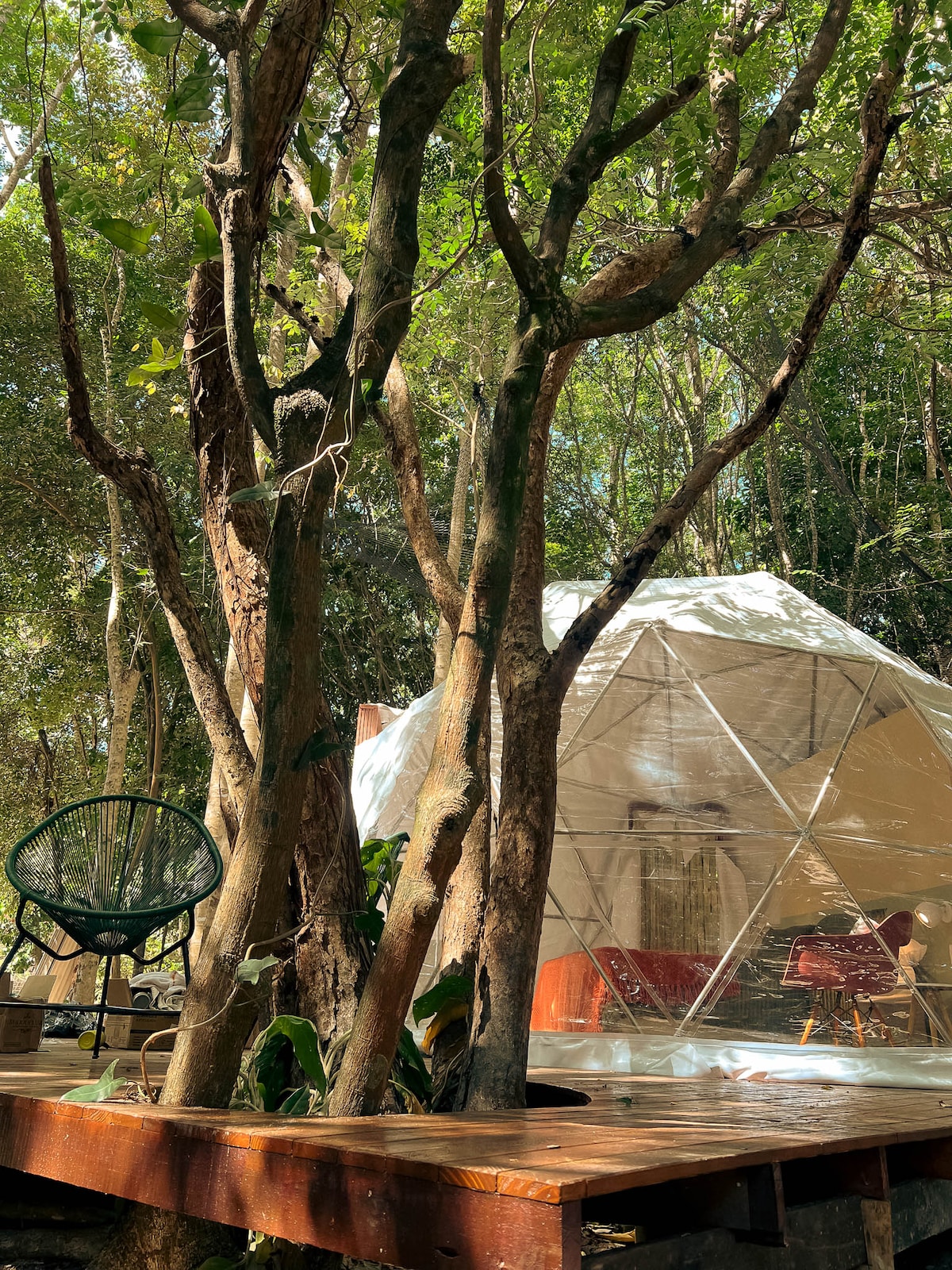 . Imerso em mata nativa 100% cercada, oferece conforto, silêncio e total privacidade. Piscina ampla sob as árvores, compartilhada apenas com outros 2 glampings da mesma área de 3000m2. Café da manhã incluso do Camurim, a 50 metros, eleito o melhor de Pipa no Tripadvisor. Localização central, ao lado do anel viário, com acesso fácil às praias e ao vilarejo, sem perder a sensação de refúgio na natureza.