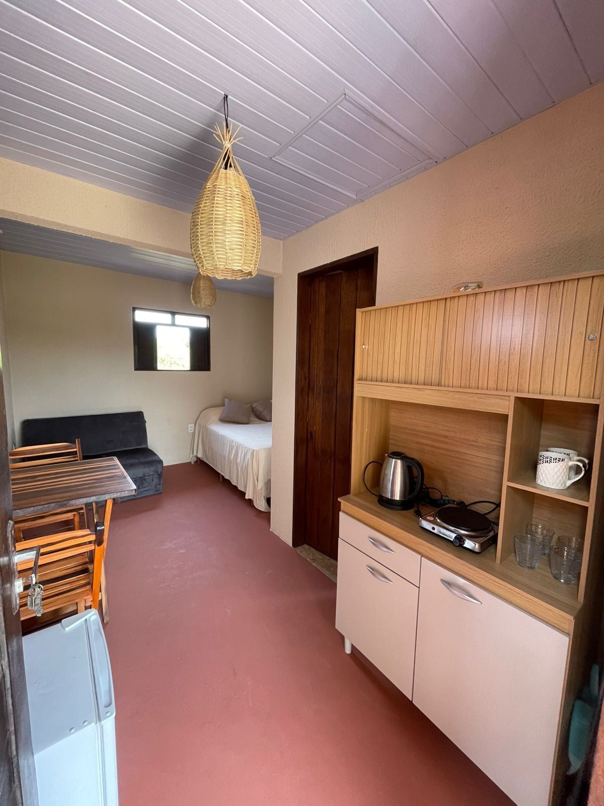 Chalezinho Suite — Cozy & Independent Perfect for guests seeking privacy, comfort, and convenience. What the suite offers • Air conditioning • Wi-Fi • Private porch with hammock, table, and 2 chairs • Compact kitchen (minibar, microwave, small electric oven, coffee maker, blender, clay water filter) • Great for preparing your own breakfast and light snacks Shared areas • Outdoor patio with hammock • Outdoor shower