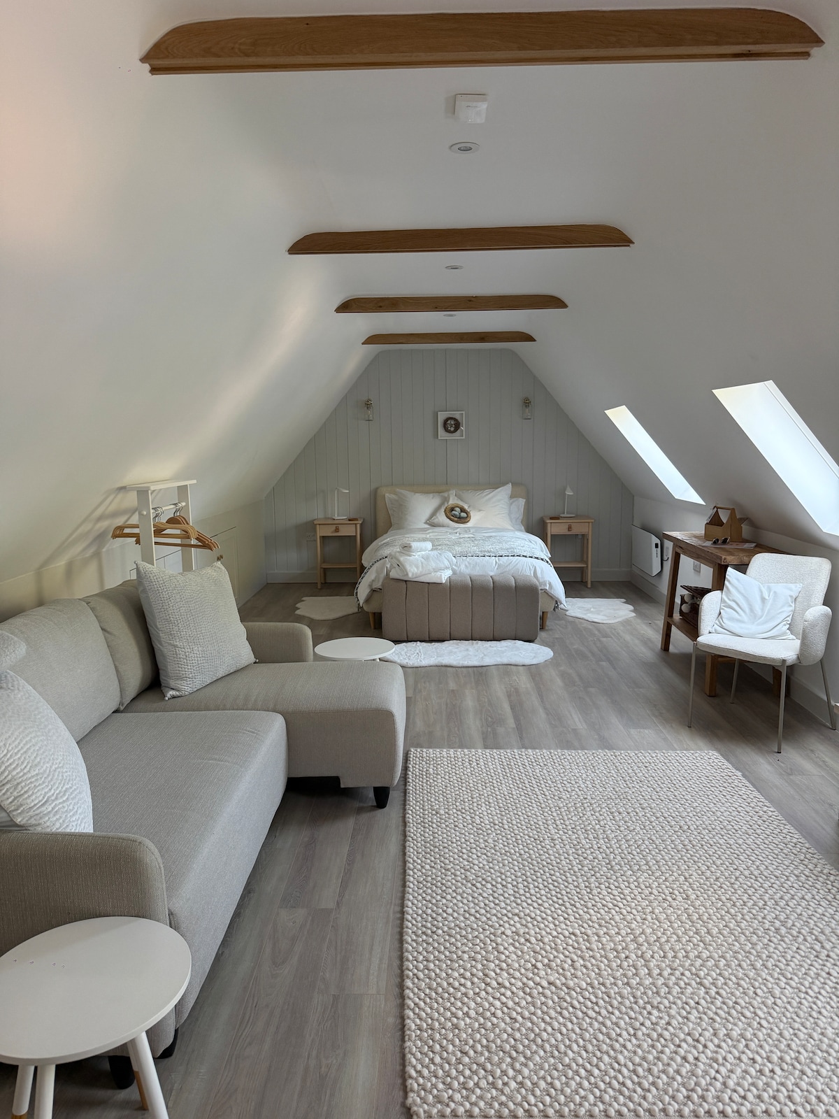The recently converted Nissen Barn is located on a farm in its own private meadow. The barn is surrounded by the beautiful Essex countryside - rolling hills, ancient trees, wildflowers and grasses, hedgerows, horses and sheep. The conversion was completed in March 2021 and sleeps 4 adults in 2 big bedrooms. There is also a loft bedroom accessed by a hidden door with a king size mattress suitable for older children or a couple. Perfect for families, but note there is no enclosed garden.