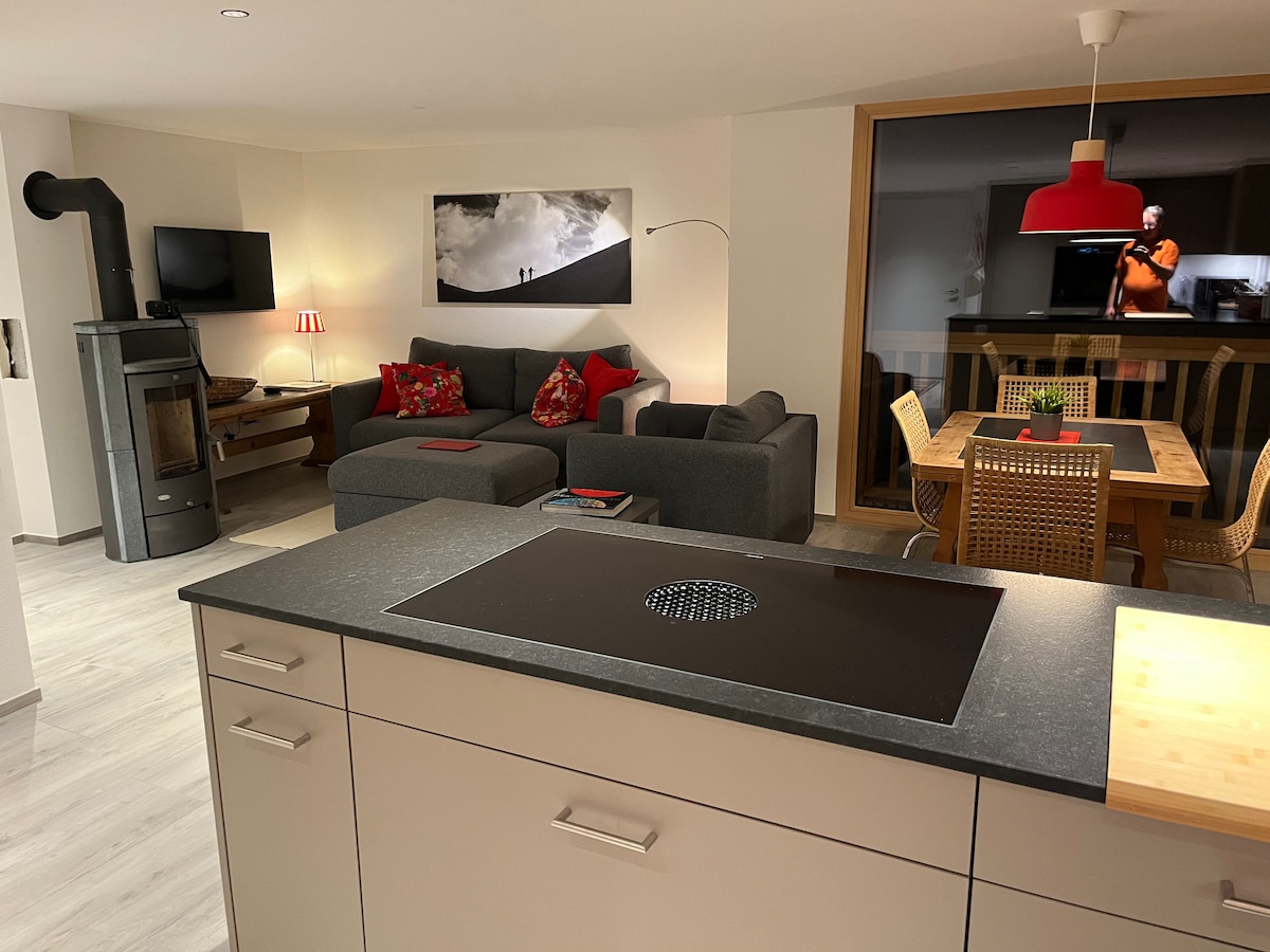 A new apartment in old walls awaits its guests. It is located directly on the Landwasser. The Rinerhornbahn and Davos Glaris train station / bus stop are a 2-minute walk away. The modern kitchen is integrated into the living room. A separate bedroom and the bathroom in blue complete the apartment. 2 rooms - seating in front of the apartment - garage space for car, skis & bike - family-friendly - Davos Klosters Premium Card included.