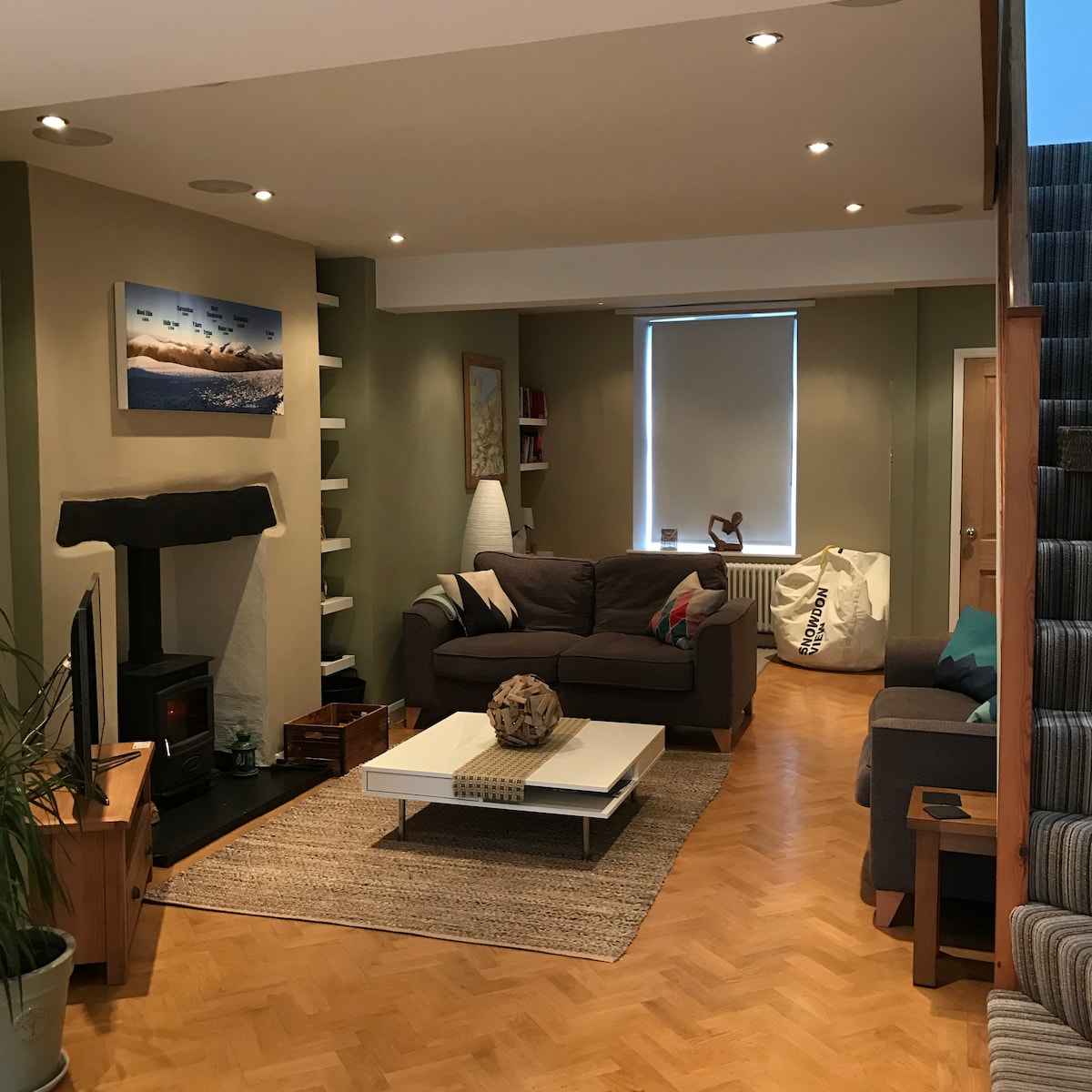 No 2 Castle Flat is a spacious luxury apartment right on the high street in Llanberis. It has been renovated to a high standard, is well insulated and warm. The living room has an electric fire and the flat has gas central heating. There is a dedicated parking space for 1 car. The apartment is in an old Georgian building and has lovely high ceilings and tall windows. The lake is a 2 minute walk away and all the amenities Llanberis has to offer is right on your doorstep.
