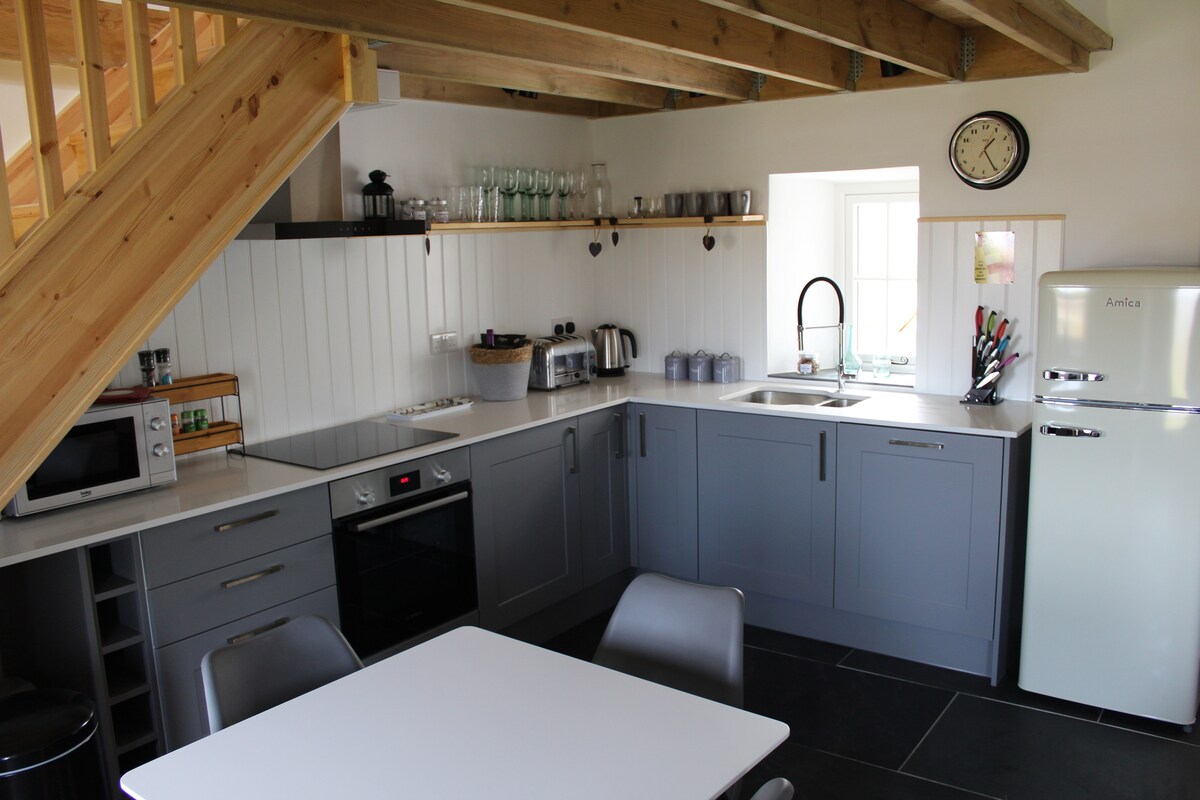 A good quality contemporary apartment situated on the first floor, accessed by stone steps adjoining the owners farm house on a working farm, in the village of Tudweiliog. It has a pleasant private balcony area, south west facing with views accross the rolling countryside. A charming mix of original beams, and clean modern interior makes this property spacious for couples. The tip of the Lleyn Peninsula is home to many sandy beaches and coves. Shop and pub one mile in village.