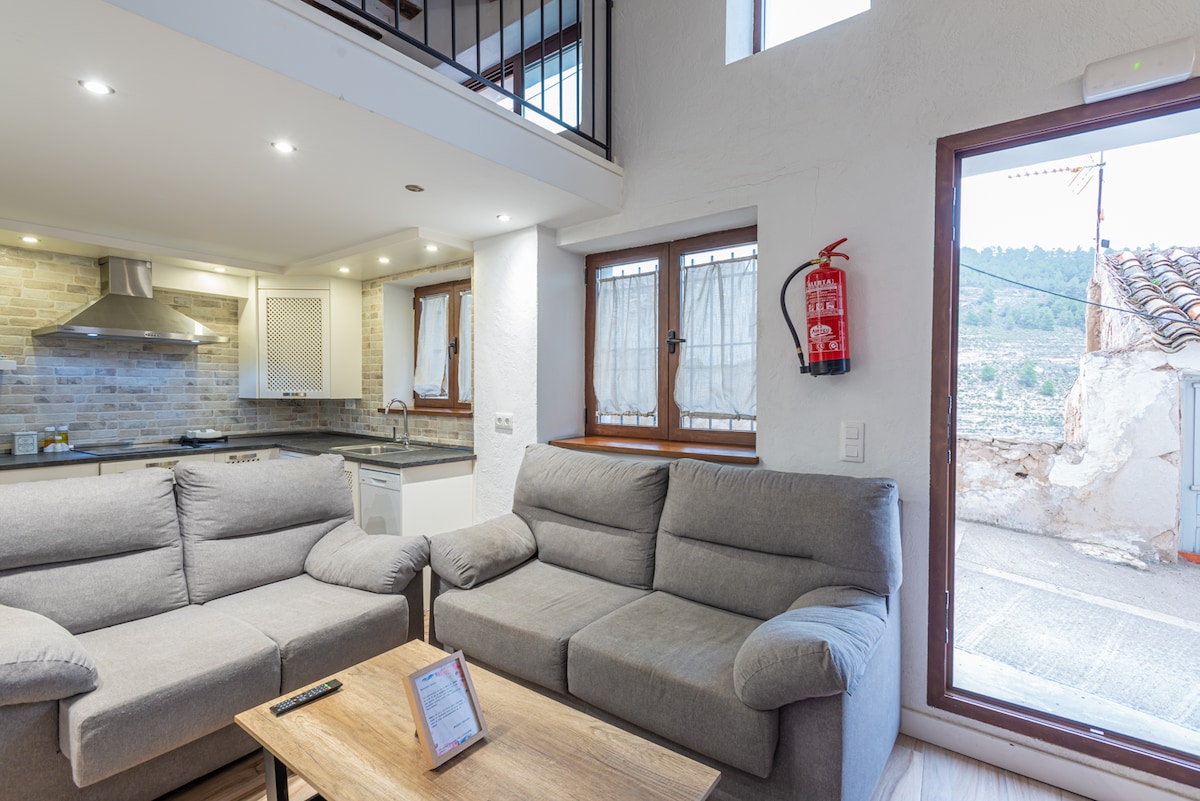 Voirnot is a 2-story house located about 40 meters from the Castle of Alcalá del Júcar, where the room is on the ground floor embedded in the mountain with a 150x200 bed, 42 Smart TV, air conditioning, jacuzzi and bathroom, on the top floor is the dining room equipped with everything you need, sofa bed, fireplace, 50" Smart TV