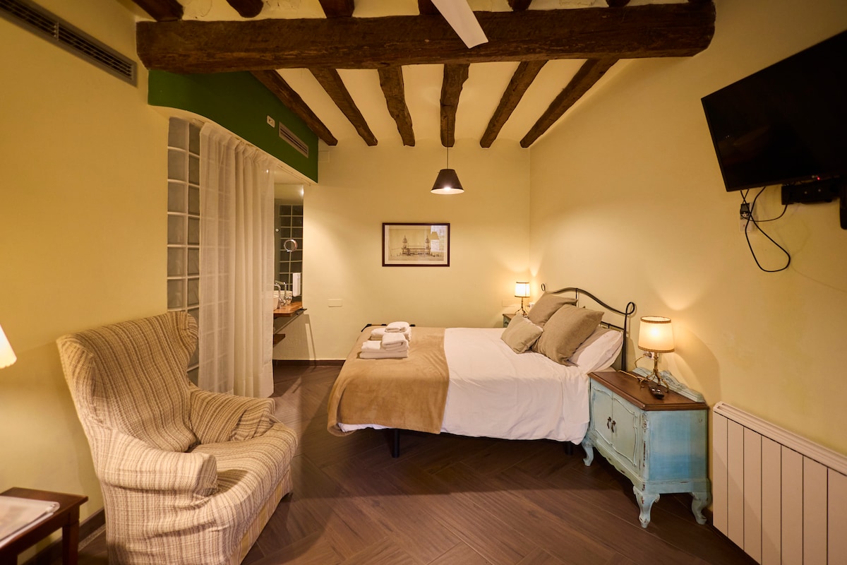 Recently restored en-suite unique space in a 16th century house with an independent access. In the entrance is a small sitting area leading into the bedroom with a balcony opening to the valley and a fully equipped bathroom (including bathtub in the room). Access to the roof terrace with fantastic views is available from the main staircase. The house is located in a small village of medieval origin in the foothills of the pre-pyrenees, close to many tourist sites.