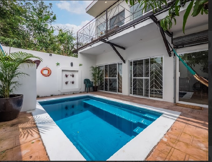**We now have a golf cart available for rent. Please ask if interested** This is a Mexican beach style home that is only a 10-15 minute walk from the beach. It is two blocks from the main road where you will find plenty of shops and restaurants. This house offers a tranquil yet fun experience by being able to hang out by the pool, bbq on the outdoor grills, or even make yourself a margarita in the outdoor bars. Perfect for couples retreats or large families!