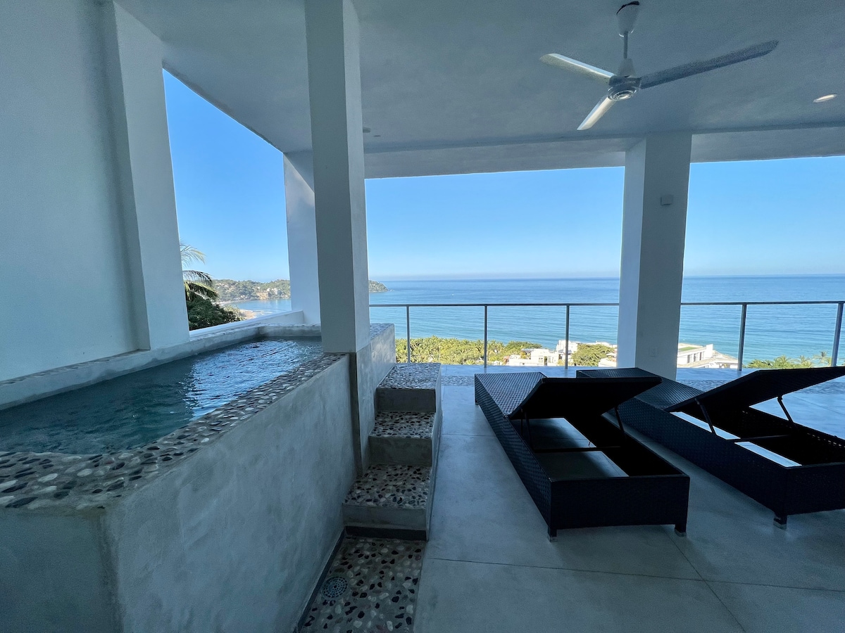 Brand new Studio apartment in Casa Infinito, Sayulita. Includes a private heated pool and infinite ocean views. Pillowtop king bed, high speed wifi and kitchenette. The mini private pool is heated. Enjoy wifi via Sayulitawifi to work from home, Smart TV, and a cozy pillowtop bed. This is the perfect romantic escape for a couple in a brand new ocean view complex just a minute drive to the beach. Common áreas include view gym and yoga deck with classes available daily