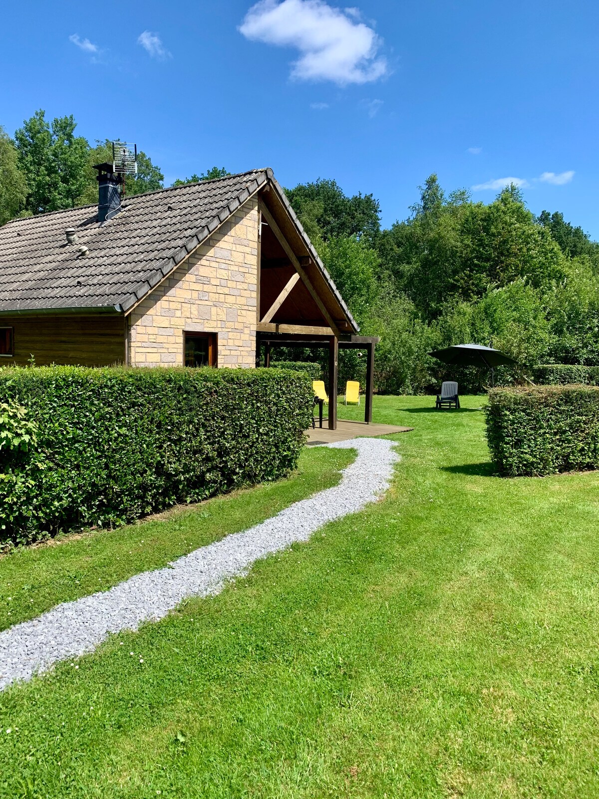 Charmant chalet tout confort, meublé tourisme 2 étoiles, se situant dans un domaine privé en bordure de forêt avec un joli jardin et une belle terrasse. Séjour détente ou sportif dans les magnifiques et verdoyantes Ardennes : chemins de randonnée, étangs pour pêcher ou se baigner, balade à cheval... Accès à pied au Camping du Domaine de la Motte : piscine couverte et chauffée gratuite (3 avril au 1er novembre 2026), mini-golf, city stade, aires de jeux... Venez vous ressourcer chez nous !