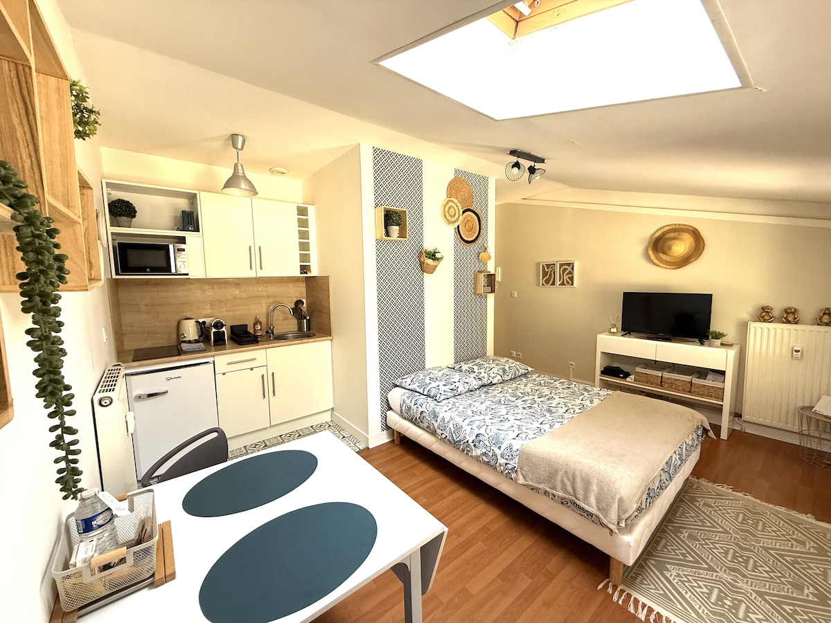 IDEALLY LOCATED in downtown Chartres, this CHARMING and BRIGHT studio is nestled in our garden, on the 1st floor of an independent annex, accessible by a private staircase. Access to the garden shared with the hosts. Self ★check-in to the property, with keypad. An 8-minute walk to the SNCF train station and a short walk to the pedestrian heart of the city and Chartres Cathedral, this elegantly and cozily decorated accommodation is the perfect place to rest after a day of sightseeing or work.