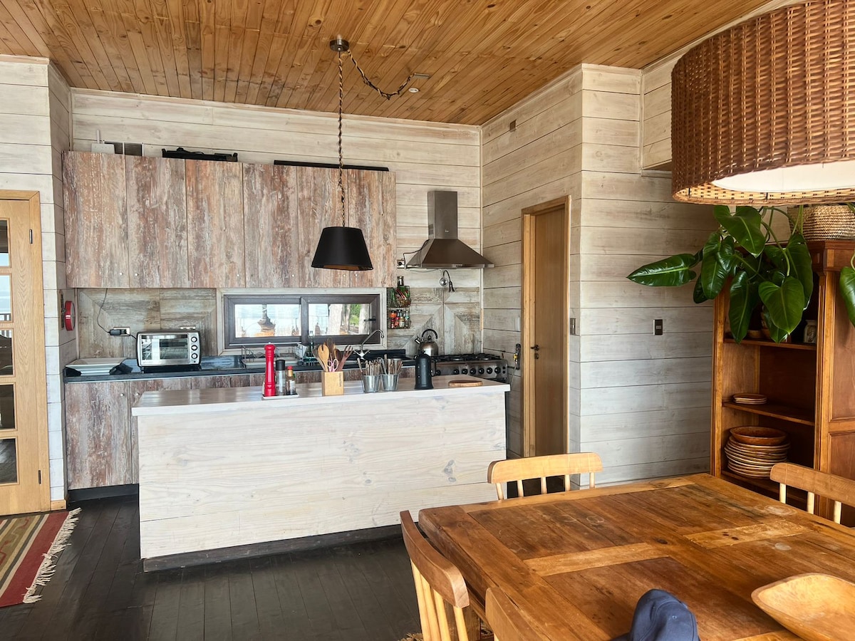 Spacious cabin Right on the oceanfront Beautiful view Double bedroom with bathroom Bedroom with sofa bed and queen-size bed Bedroom with three-body sofa bed Two bathrooms Open-plan kitchen with gas countertop, electronic oven, microwave oven, electric kettle, electric toaster, among others. Dining room for eight people Living room with Smart TV Wi-Fi Bosca wood-burning stove (includes wood) Closed Quincho with windows and terrace dining room