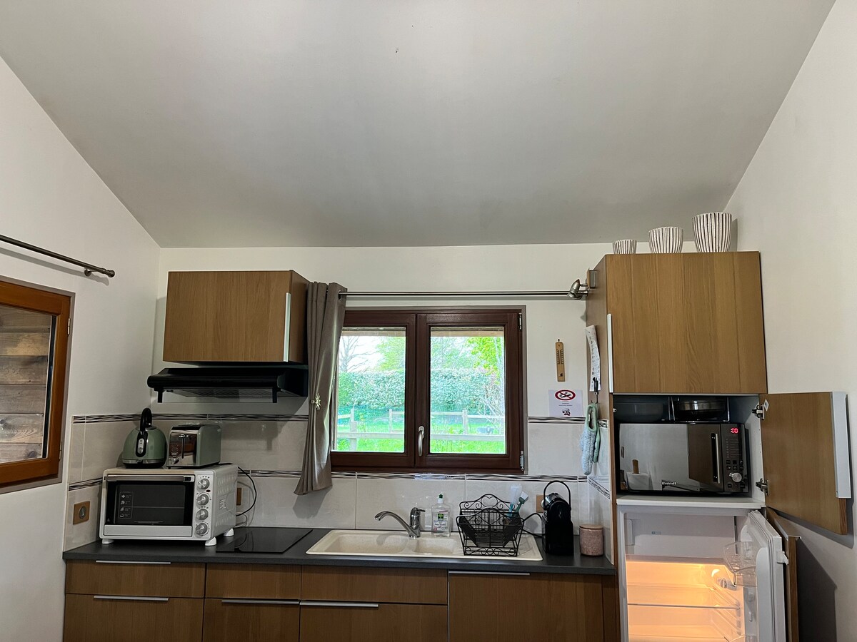 Welcome to Le Chant des Pierres - Between Land and Sea. La Ganache is a cottage on our 8000m2 wooded lot, where our house is located, adjoining the second gite Les Mirettes. In the countryside and close to the sea, you will share with Les Mirettes: 1 outdoor swimming pool heated from mid-June to mid-September (dates according to weather), games room with billiards and board games, veranda library, ping-pong table, hammocks, adult and child bicycles + baby seat, vegetable garden, animals (sheep, chickens, cows and cats)