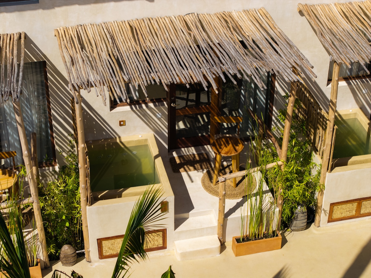 In our cozy accommodation with a private entrance, a king-size bed, a spacious terrace, and a garden, you'll find the perfect combination of modern comfort and tranquility. 👤 Place for up to 2 guests 🛏 1 bedroom, 1 bathroom 💻 1 workspace 🚀 WIFI 80 Mbps 🥶 Air conditioning 🔥 Hot water 🆓 Free drinking water 🌴 Terrace 🅿️ Parking (scooter only) 💤 Soundproof accommodation 🛵 Please note that a scooter is necessary here. There is no Grab available in Kuta..