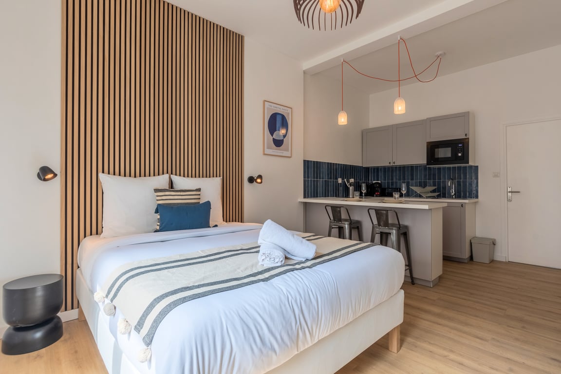 Welcome to your private 46 m² cottage, quiet and surrounded by greenery, just 20 minutes from the center of Lille! Enjoy a large bedroom with queen size bed, bright kitchen overlooking the garden, seating area and modern bathroom. Private parking, air conditioning, linen provided. Lomme Bourg metro and shops 5 min walk. A unique cocoon to combine comfort, rest and proximity to the city.