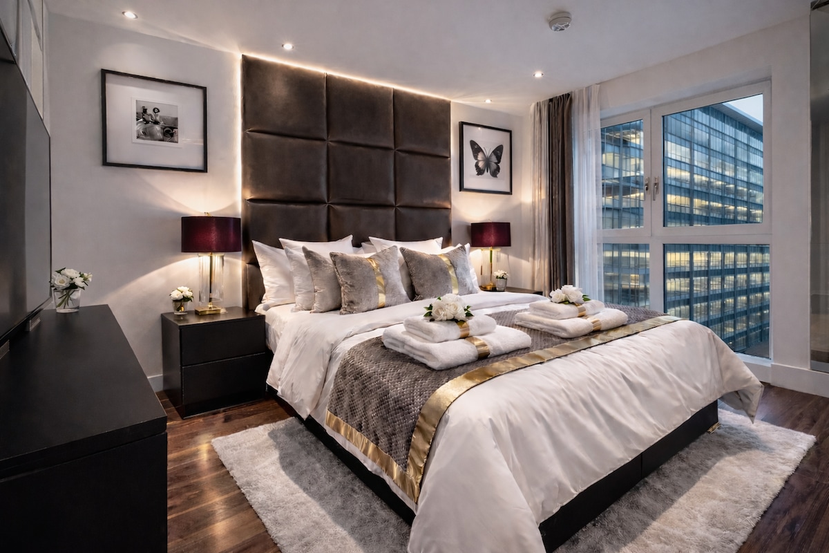 Luxury apartment in Royal Docks (London , Newham) with amazing views of The Thames, Royal Docks, o2 Arena, iconic skyline of Canary Wharf , Canning Town & London city 5 mins walk - EXCEL LONDON 1 min walk- IFS CLOUD CABLE Car for Greenwich O2 5 mins walk- Custom House station (Elizabeth line) for Central London in 8 mins , Canary Wharf in 4 mins & direct trains to Heathrow airport) 1 mins walk to Royal Victoria DLR station City airport - 7 minutes Of course all of London is easily accessible