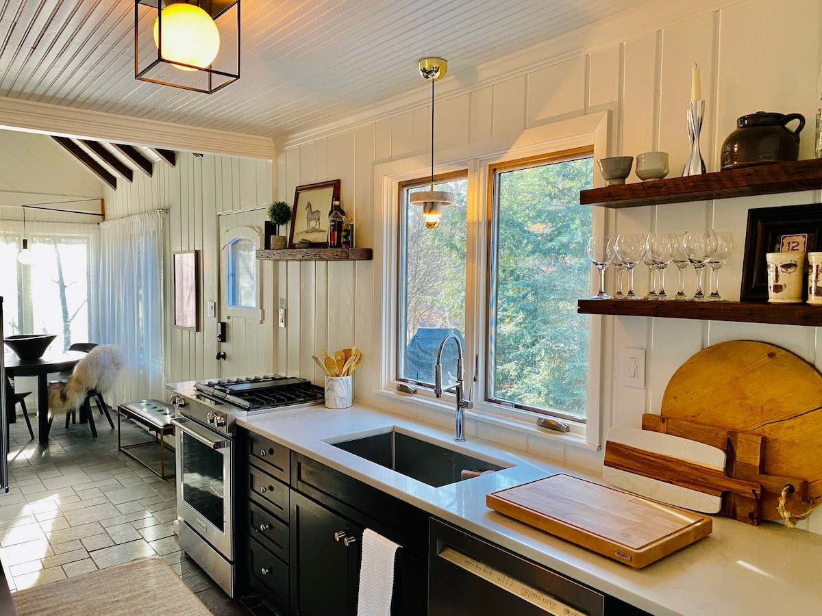 Cozy, charming, romantic and modern. Huusli is the perfect place for a couple to getaway, not too big, not too small. Soaring ceiling with wood burning fireplace greets you in the main living area with an updated kitchen, remodeled bathroom and two adorable bedrooms. Bonus is the four-season room where you can have all your meals or enjoy your morning coffee surrounded by nature, but without the fear of bugs. Make new memories, celebrate an anniversary or just relax in this magical place.