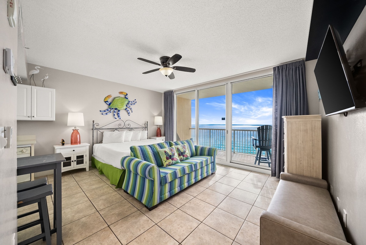 Located in Tower 1 on the 9th floor, our studio offers breathtaking, unparalleled panoramic views of the Gulf of Mexico. This oceanfront condo features standard furnishings and ample space, making it the perfect opportunity for a romantic getaway in one of PCB's most popular resorts: Majestic Beach Resort. This space will feel like a hotel just feet away from the beach. Beach service is included (2 beach lounges and 1 umbrella) from March 1st to October 31st, valued at $60 per day.
