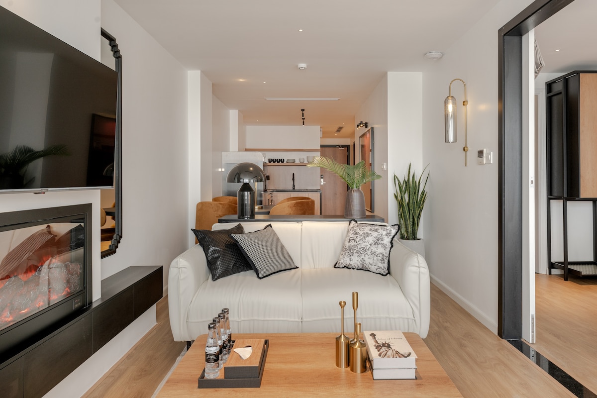 Gerbera The Montclair – Signature Loft with Large Window | Crafted Luxury Living A bright and cozy top-floor apartment featuring a large window that fills the space with natural light. Designed in warm Mid-Century style, it offers a spacious sofa, a soft comfortable bed, a stylish fireplace, and wood-tone furnishings that create an inviting, homely atmosphere — perfect for a relaxing stay in the heart of the city.