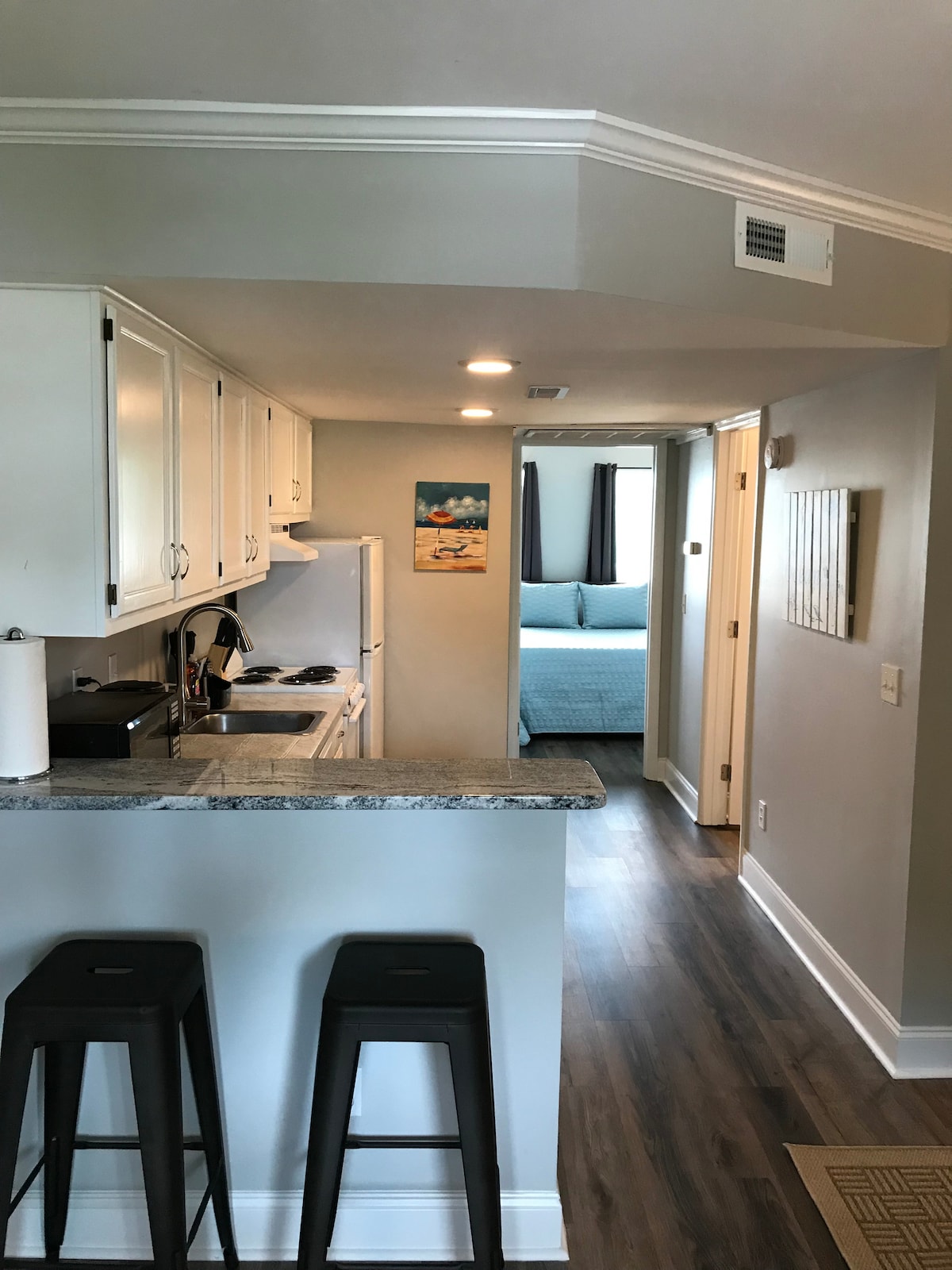Lovely apartment, private space. Open and spacious dining and living area. Well equipped kitchen: refrigerator, full stove/oven, microwave, toaster, blender, coffee makers, pots, pans, dishes, utensils. Breakfast makings on hand. Media room with Smart TV, comfy seating, computer work station. Large, roomy master bedroom w/ king size bed OR TRANSFORMS INTO TWO TWINS. Bath adjoins bedroom, walk in shower, no tub. Beaches, downtown Wilmington, UNCW, all within a 15 minute drive.