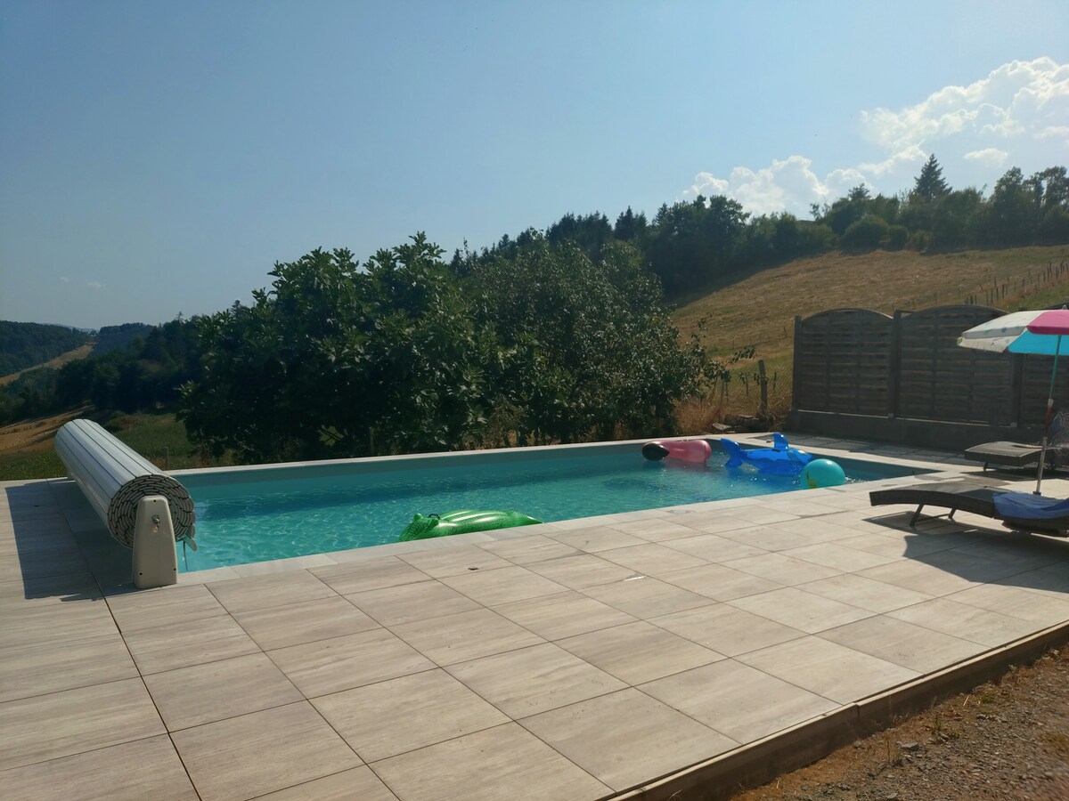 Profitez du cadre charmant de ce logement en pleine nature avec une vue magnifique sur les collines et le château pour vous ressourcez. Chalet chauffé, cuisine tout équipée, 2 chambres avec lit double , 1 avec lit superposé, salle de bain, wc séparé .Grande terrasse avec jacuzzi privé et brasero ( bois non inclus) pour des moments de partage en famille ou entre amis Direct chemin pédestre , balade à cheval, karting, parc des loups... Linge de lit et serviettes de bain inclus A 45 min de Lyon