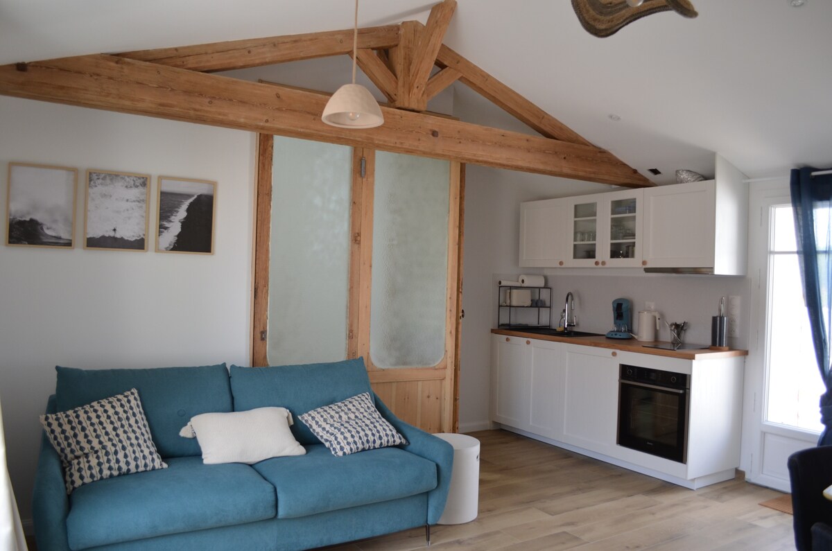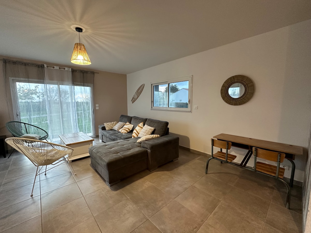 Kick back and relax in this calm, stylish space. Fully equipped T1 apartment located on the ground floor of a residential house occupied by a couple of young retirees. This independent, new accommodation, bathed in greenery, located 10 minutes by bike from the shops, 1500 meters walk from the beaches via the forest will seduce you with its calm. You can discover the state forest and its sports trail, take the coastal bike paths directly from the apartment.